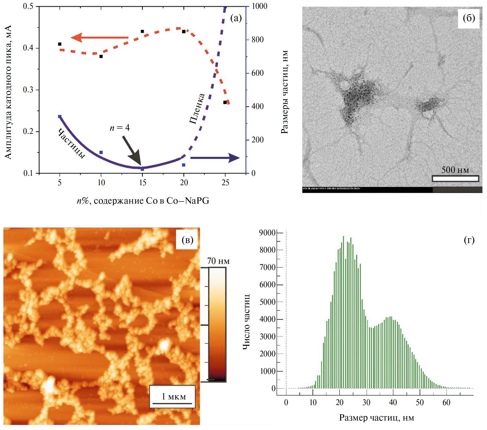 Рис. 3. Морфологические характеристики и амплитуды пика восстановления кислорода на кривых ЦВА образцов Co(n%)–NaPG от содержания кобальта (а); ПЭМ- (б) и АСМ- (в) изображения агрегатов Co–NaPG с содержанием кобальта 15% и соответствующая АСМ-изображению топографическая гистограмма (г).