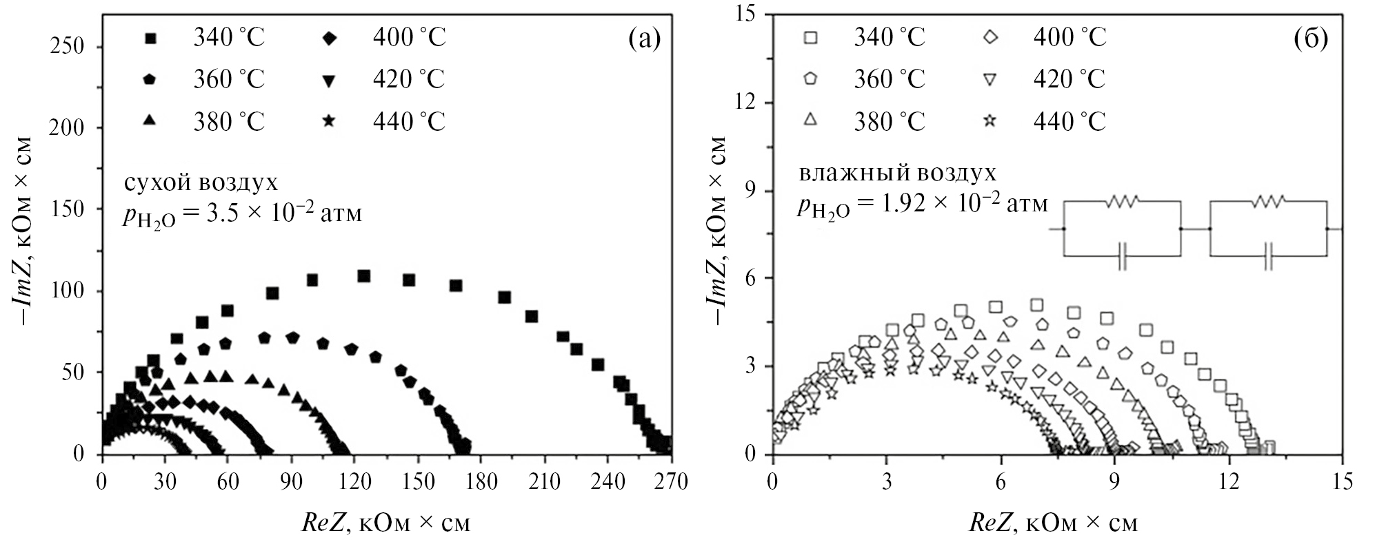 На рис. 4 представлены примеры эволюции годографов импеданса в координатах Найквиста при варьировании температуры в сухом (рис. 4а) и влажном (рис. 4б) воздухе.
