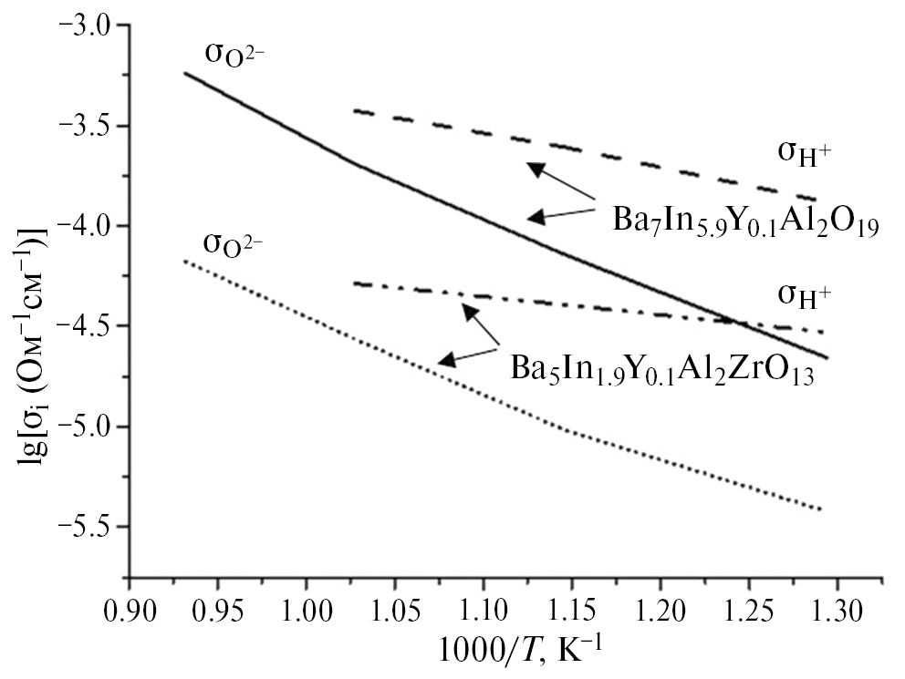 Сравнение температурных зависимостей протонных проводимостей двух Y-допированных фаз Ba7In5.9Y0.1Al2O19 и Ba5In1.9Y0.1Al2ZrO13 показано на рис. 7. Видно, что как для кислород-ионной проводимости, так и для протонной проводимости более высокие значения наблюдались для фазы Ba7In5.9Y0.1Al2O19. То есть можно констатировать влияние динамики кислородной подрешетки на протонный транспорт. Симбатное поведение кислородно-ионной и протонной проводимостей, демонстрирующее влияние состояния кислородной подрешетки на формирование протонной проводимости, ранее было описано для акцепторно-допированных перовскитов и подтверждено для многочисленных соединений. Очевидно, что такие общие закономерности являются типичными для различных структурных типов протон-проводящих сложных оксидов.