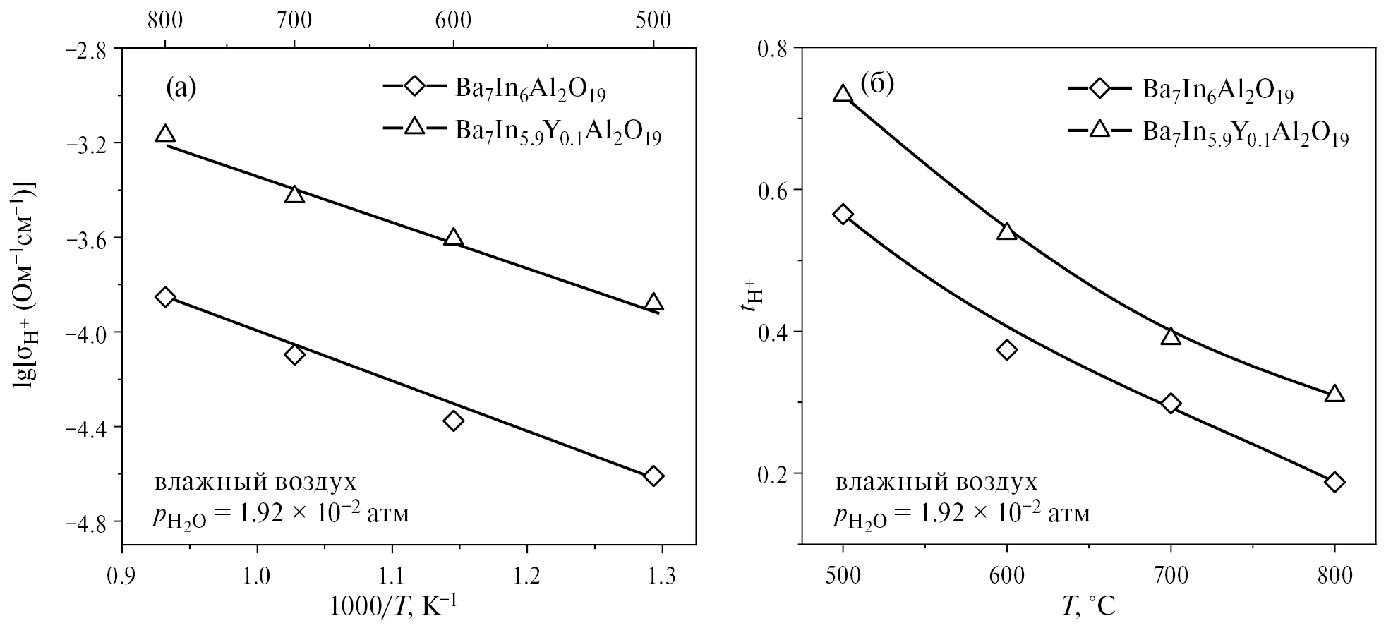 Для атмосферы влажного воздуха (pH2O = 1.92×10–2 атм) был проведен аналогичный комплекс исследований. Наличие кислородных вакансий в структуре фаз Ba7In6Al2O19 и Ba7In5.9Y0.1Al2O19 обуславливает появление протонных дефектов при взаимодействии образцов с водосодержащей газовой фазой и, как следствие, возникновение протонной проводимости. Рисунок 5в демонстрирует наиболее типичное поведение проводимости протонных проводников при смене влажности атмосферы. Можно выделить следующие общие закономерности, обусловленные внедрением воды в структуру и появлением протонной составляющей проводимости: