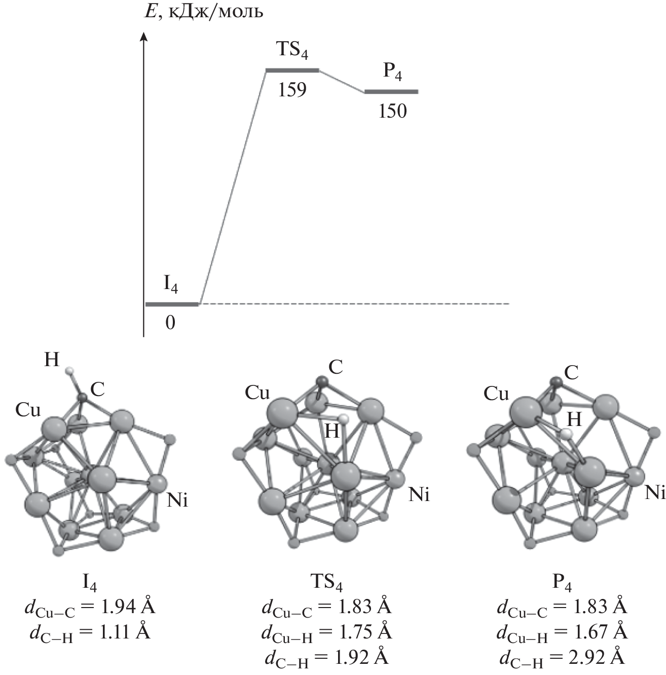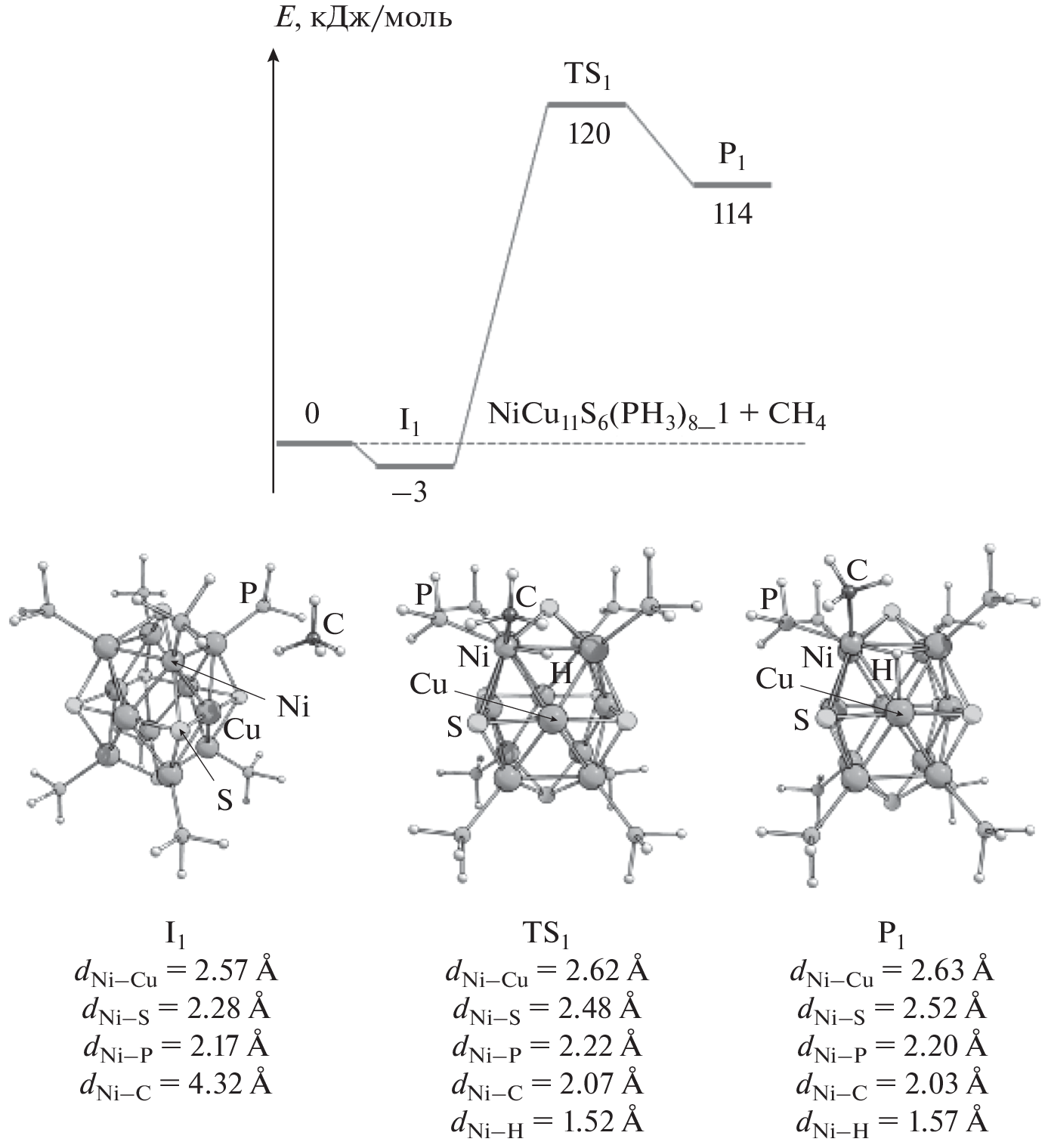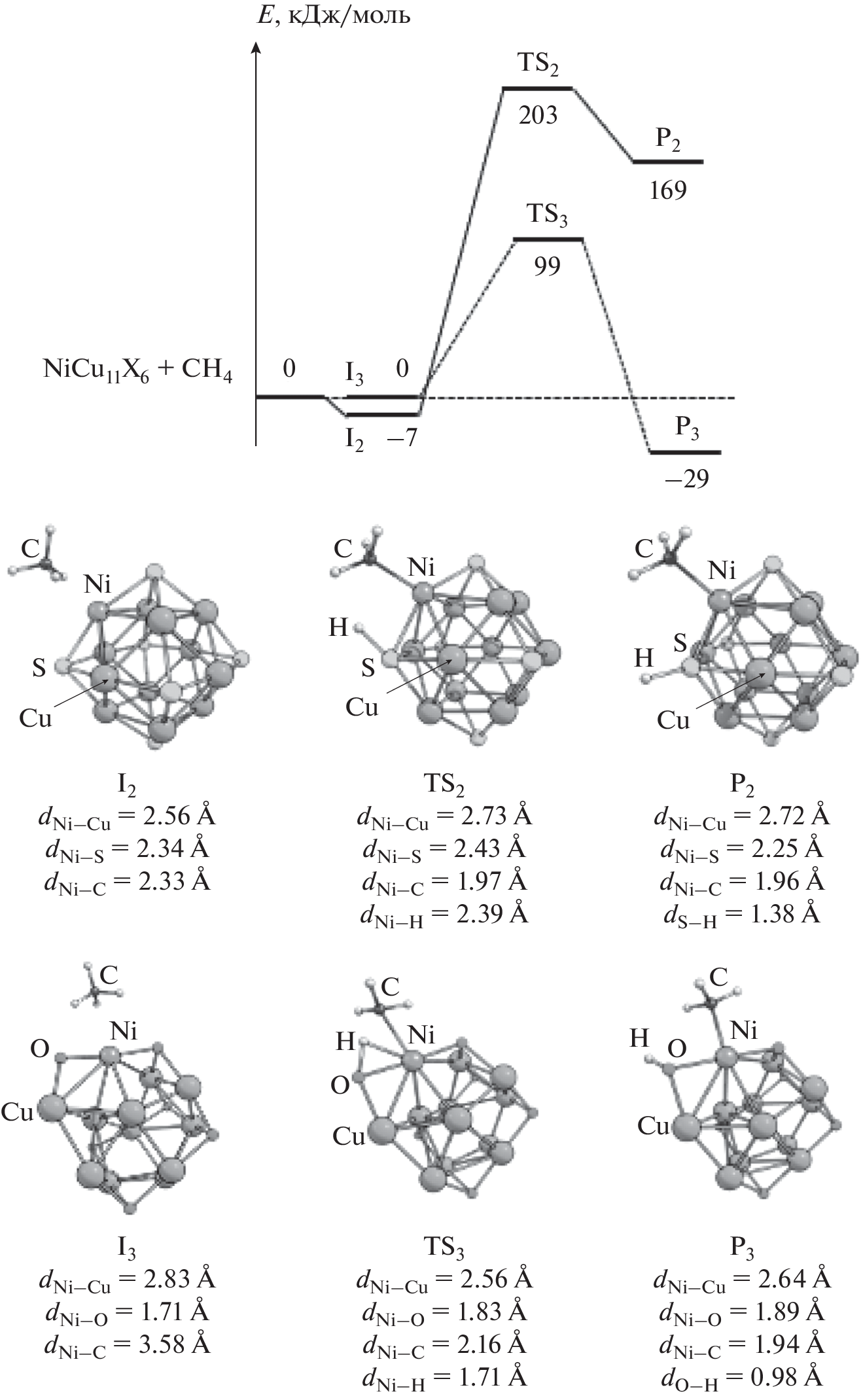 Density functional theory (DFT) (PBE) was used for modeling of C–H bond breaking in methane on Ni–Cu clusters enriched in copper as the first stage of catalytic dry reforming of methane. Nanosized clusters NiCu11S6(PH3)8, NiCu11S6, NiCu11O6(PH3)8, NiCu11O6 are considered as catalyst models. The binding energy for methane with clusters was calculated and the activation energy of the \({\text{CH}}_{4}^{*}\) → \({\text{CH}}_{3}^{*}\) + H* step was determined. Based on the data obtained, it was found that the NiCu11O6 catalytic system is the most promising for CH4 activation both in kinetic (activation energy is 99 kJ/mol) and thermodynamic (step energy change is –29 kJ/mol) aspects. To assess the stability of the NiCu11O6 cluster towards coke formation, CH adsorption followed by dissociation (CH* → C* + H*) was modeled. The calculated value of the activation energy of this step is rather high, 159 kJ/mol.