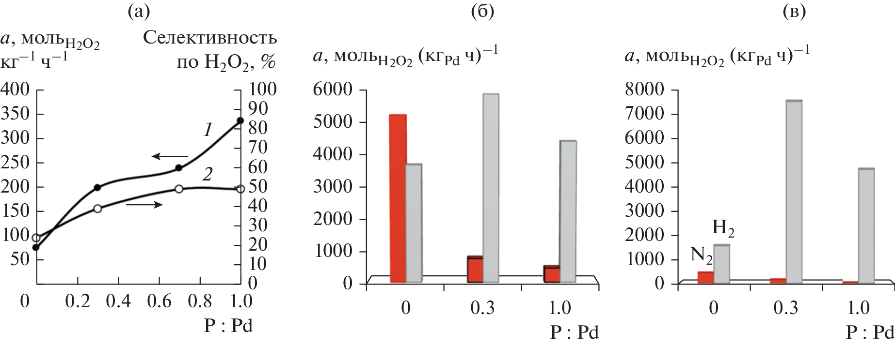 The main reasons for the promoting effect of phosphorus on the properties of Pd–P/ZSM-5 palladium catalysts in the direct synthesis of H2O2 from H2 and O2 under mild conditions are considered based on data from X-ray photoelectron spectroscopy (XPS), X-ray powder diffraction (XRD), high-resolution transmission electron microscopy (HRTEM), and inductively coupled plasma mass spectrometry (ICP MS). It is shown that the introduction of phosphorus into the composition of the catalyst affects the dispersity, the electronic state of palladium in the surface layer, and the surface concentration of phosphate and phosphite ions. An increase in the H2O2 yield is favored by an increase in the dispersion of Pd–P-catalysts, inhibition of the side process of H2O2 decomposition by surface phosphate and phosphite ions, and a decrease in the solubility of hydrogen in solid solutions of phosphorus in palladium.