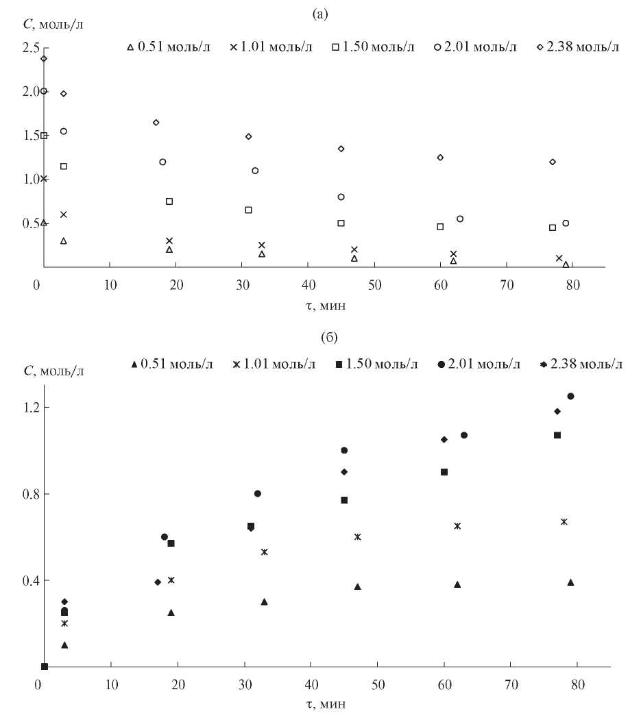 При постоянной начальной концентрации пероксида водорода (C0ПВ = 2.38 моль/л) проведена серия специальных экспериментов для изучения влияния концентрации аллилхлорида на кинетику эпоксидирования (начальную концентрацию аллилхлорида (C0АХ) изменяли в диапазоне 0.50–2.34 моль/л). Кинетические кривые изменения концентраций аллилхлорида и продукта представлены на рис. 3а и 3б.