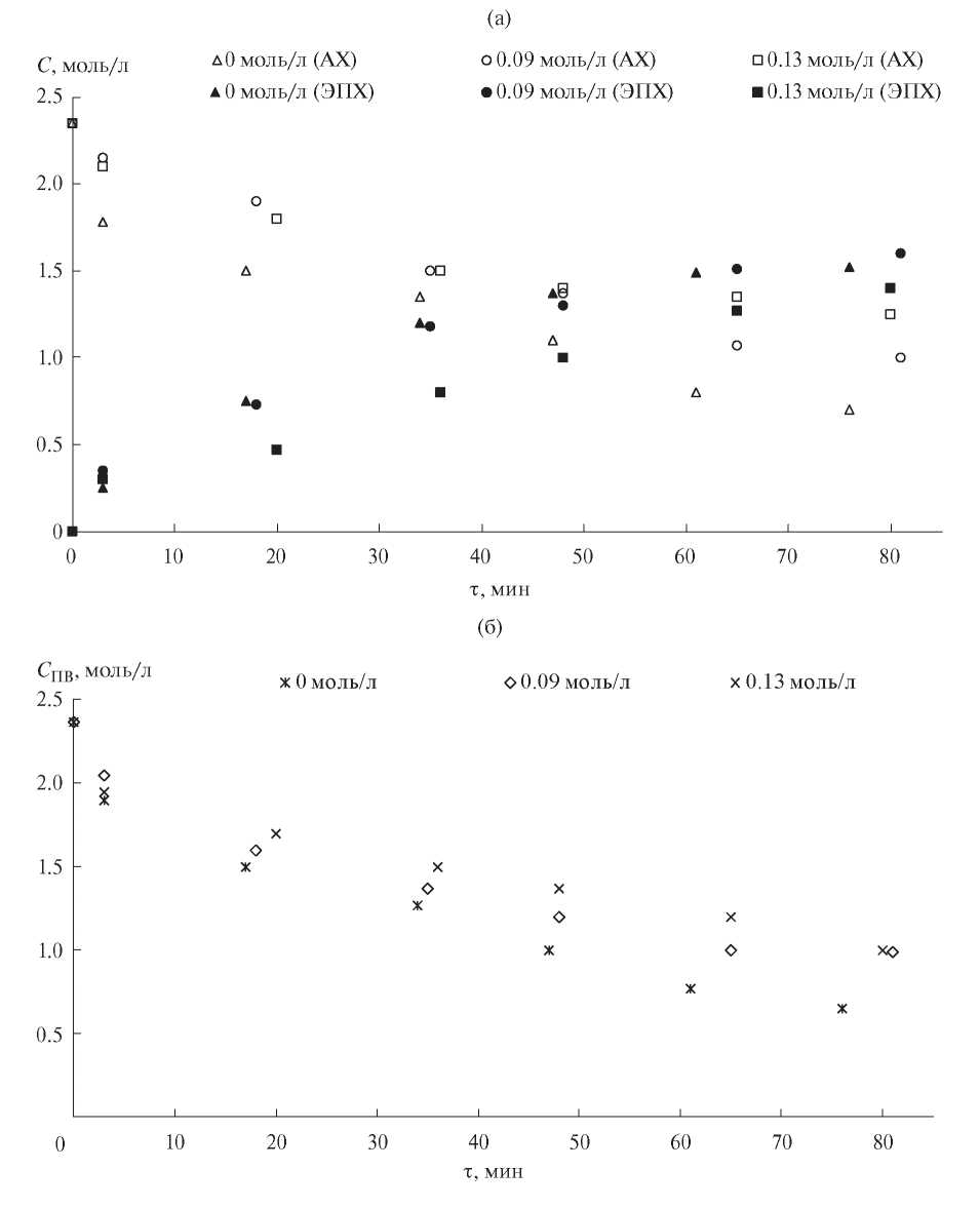 Также были выполнены эксперименты при постоянных C0АХ = 2.35 моль/л и C0ПВ = 2.37 моль/л и варьируемой начальной концентрации продукта (добавление в исходную смесь 0.09 моль/л и 0.13 моль/л ЭПХ, 0.00 моль/л – без добавки). Кинетические кривые изменения концентраций реагентов и продукта представлены на рис. 5а и 5б.