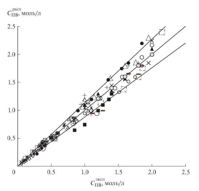 Из приведенных в табл. 2 и 3 данных следует, что Гипотезы 1–7, не учитывающие торможение скорости образования эпихлоргидрина при увеличении его концентрации, не позволяют получить удовлетворительное описание, однако в случае процесса эпоксидирования аллилхлорида оно значительно лучше по сравнению с описанием эпоксидирования аллилового спирта в глицидол. При переходе к моделям, учитывающим торможение скорости продуктом (модели 8–14), для всех случаев происходит улучшение качества описания. Тем не менее, если для синтеза глицидола удалось определить, что гипотетические механизмы 8 и 14 дают более качественное описание по совокупности двух статистических показателей (S и ), чем остальные гипотезы, то для синтеза эпихлоргидрина Гипотезы 8–14 дают примерно одинаковое качество совпадения расчетных кривых с экспериментальными зависимостями.