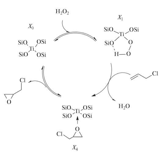 Примечание. X0 – активный центр катализатора, интермедиат X1 – продукт адсорбции H2O2 на X0, X2 – продукт адсорбции алкена на X0, интермедиат X3 представляет собой X0, на котором одновременно адсорибировались пероксид водорода и алкен, X4 – продукт адсорбции эпоксида на X0.