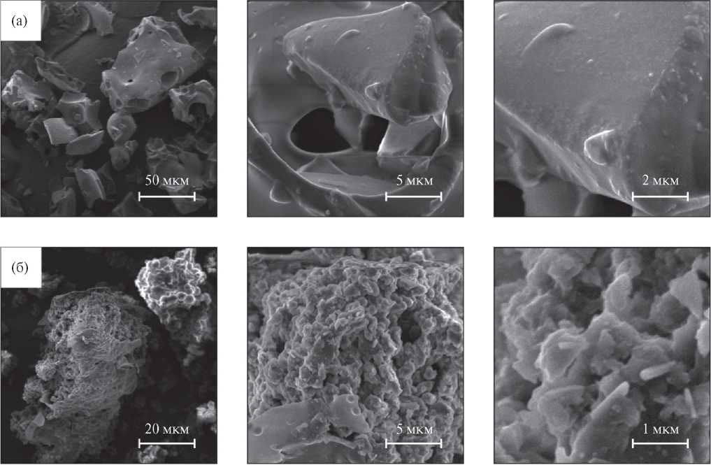 Рис. 1. СЭМ-изображения поверхности исходного лигносульфоната (а) и синтезированного катализатора (б).