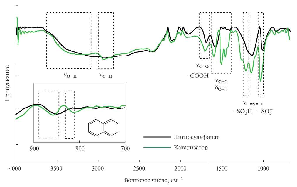 Катализатор, полученный сернокислотной обработкой ЛС, сохраняет функциональные группы, характерные для лигносульфонатной матрицы (рис. 2). На ИК-спектре наблюдается изменение интенсивностей полос поглощения, относящихся к деформационным колебаниям конденсированных ароматических колец. Появление выраженной полосы поглощения в области 850–890 см–1 может характеризовать увеличение количества изолированных ароматических колец. В то же время появляются полосы поглощения, которые можно отнести к деформационным колебаниям конденсированных ароматических колец (n = 2) при 815–830 см–1. Усиление ароматических сигналов в ИК-спектрах, соответствующих конденсированным кольцам, свидетельствует о том, что при сульфировании протекает интенсивная сшивка и перегруппировка структуры.
