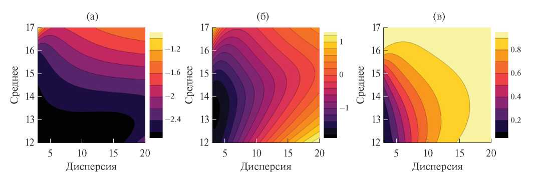 Рис. 6. Зависимость логарифма среднеквадратичного отклонения среднего (а) и дисперсии (б) в зависимости от истинных параметров модели.