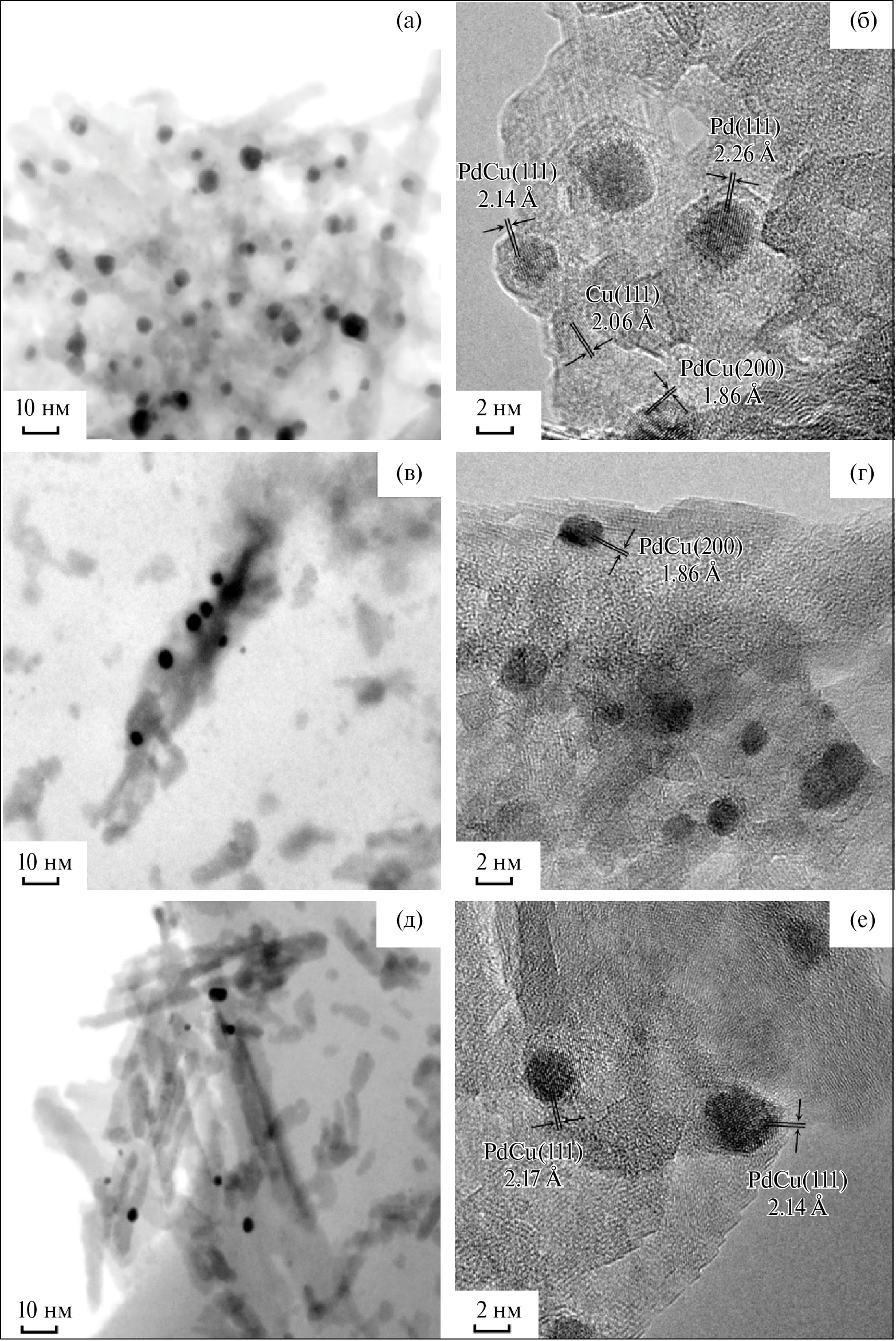 Из микрофотографий ПЭМ-ВР видно, что на поверхности образцов 0.2% Cu/0.3% Pd/5% MO/ /Al2O3 присутствуют частицы Cu размером 4 ± 1 нм (рис. 2б). Поверхность частиц Cu содержит грань с межплоскостным расстоянием 2.06 Å, которое близко к таковому в грани Cu(111) металлической меди (JCPDS 04-0836). Индивидуальные частицы Pd имеют размер 9 ± 2 нм (рис. 2б и 2е). На поверхности Pd-частиц имеются области упорядоченных атомов с межплоскостным расстоянием 2.26 Å, которое близко к таковому в грани Pd(111) нуль-валентного палладия (JCPDS 65-6174). На поверхности биметаллических частиц наблюдаются области упорядоченных атомов с межплоскостным расстоянием 2.14 Å (рис. 2б и 2е). Значение 2.14 Å меньше такового в грани Pd(111) на поверхности частиц Pd, но больше, чем межплоскостное расстояние в грани Сu(111) частиц меди. Полученный результат можно объяснить образованием частиц PdCu-сплава [22, 23].