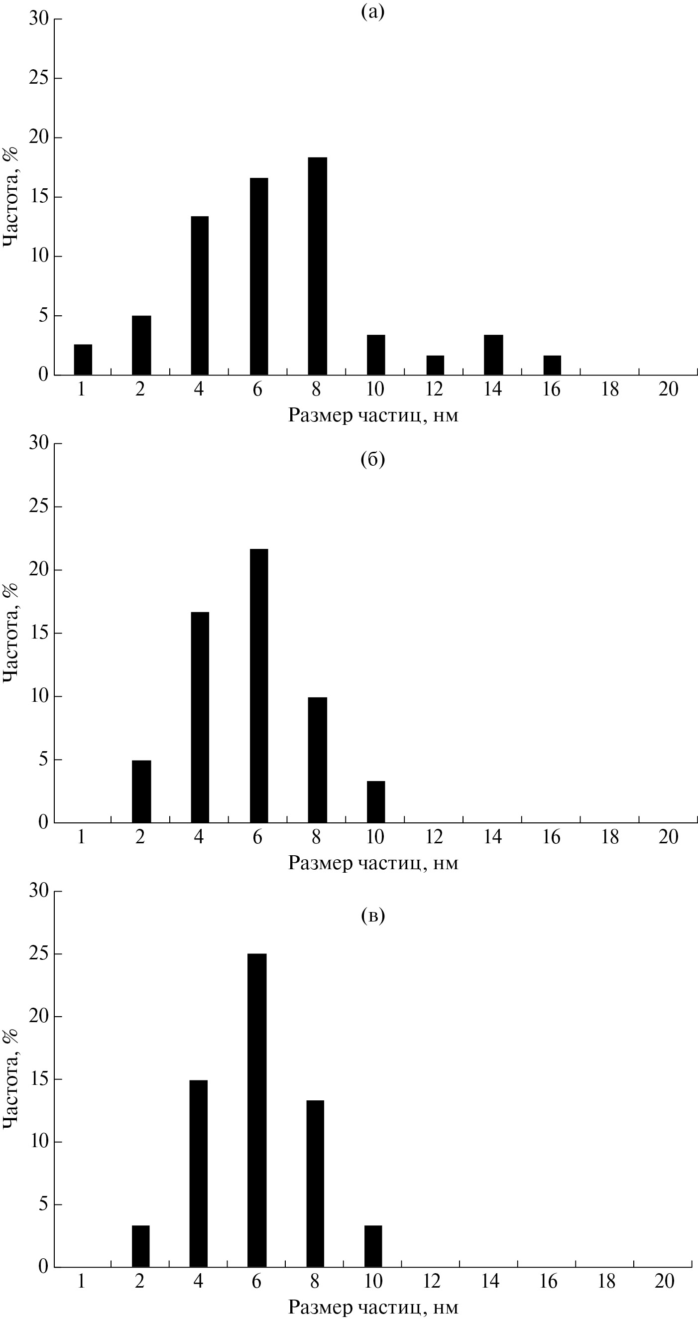 Рис. 3. Гистограммы распределения PdCu-частиц по размеру для образцов 0.2% Cu/0.3% Pd/5% CaO/Al2O3 (а), 0.2% Cu/0.3% Pd/5% SrO/Al2O3 (б) и 0.2% Cu/0.3% Pd/5% BaO/Al2O3 (в).