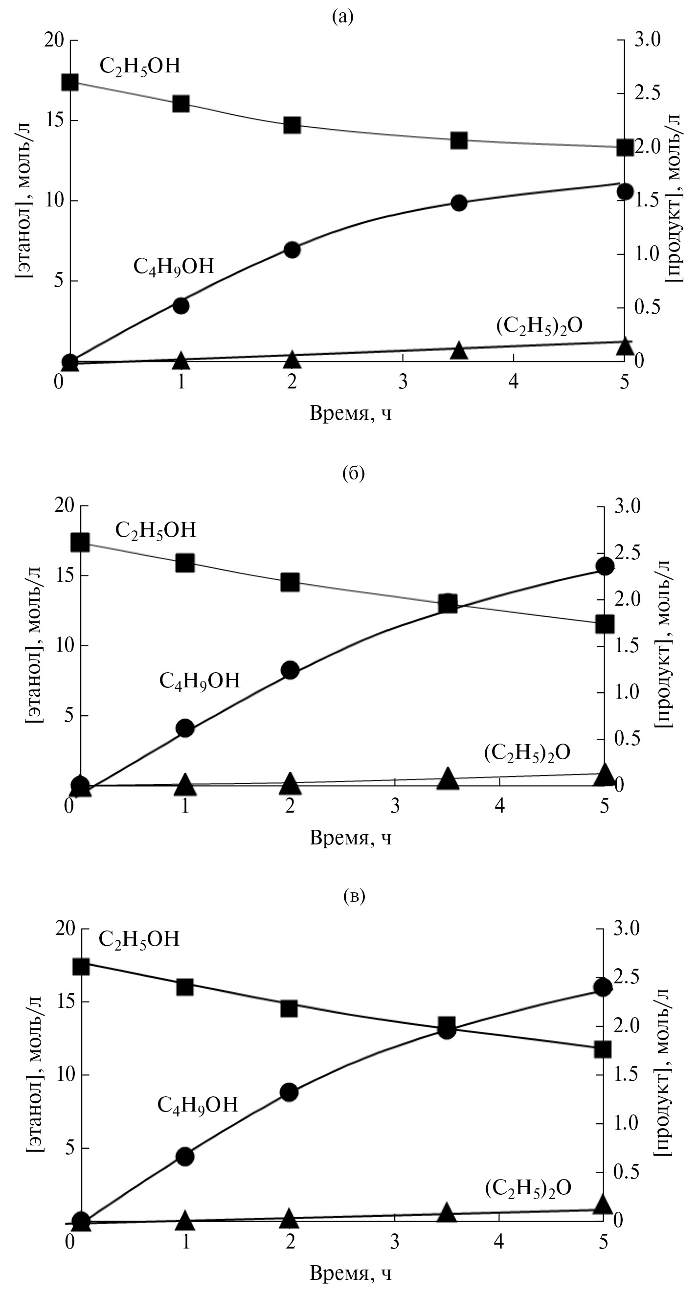 Рис. 5. Кинетические кривые расхода этанола и накопления продуктов в присутствии катализаторов 0.2% Cu/0.3% Pd/5% CaO/Al2O3 (а), 0.2% Cu/0.3% Pd/5% SrO/Al2O3 (б) и 0.2% Cu/0.3% Pd/5% BaO/Al2O3 (в).