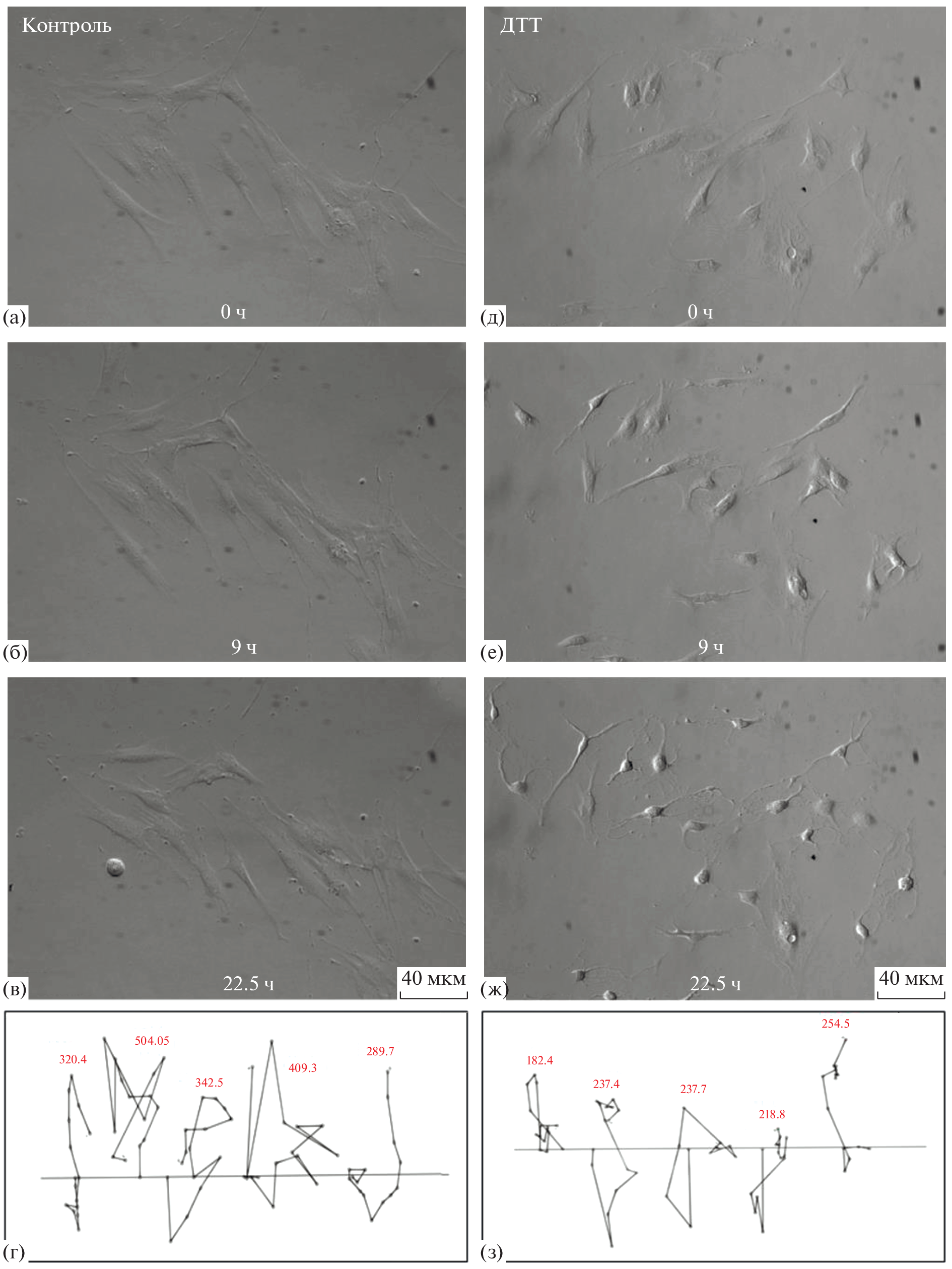 Some inducers of endoplasmic reticulum (ER) stress can affect the motility of normal and tumor cells. However, it is unknown what mechanisms mediate this effect and whether it is a consequence of ER stress. The aim of our work was to study the effect of the ER stress inducer dithiothreitol (DTT) on morphological features reflecting the locomotor properties of cells, as well as directly on the migratory properties of cultured human dermal fibroblasts and fibrosarcoma HT1080 cells. We have shown that DTT causes disruption of the organization of actin cytoskeleton in both types of cells, which is accompanied by a change in the cell surface and shape of cells, as well as a decrease in their spreading area. In addition, a decrease in the number of focal contacts was observed in dermal fibroblasts. DTT also reduced the motility of dermal fibroblasts and fibrosarcoma cells. To analyze cell motility and determine the moment of its change, we developed a method which showed that the change in the migratory properties of fibrosarcoma cells cultured with DTT began earlier than in dermal fibroblasts. Thus, activation of ER stress by DTT is accompanied by a change in the organization of the actin cytoskeleton and motility in normal and tumor human cells. Consequently, ER stress triggered by various inducers with different mechanisms of action affects the motility of normal and tumor cells, which must be taken into account when developing antitumor drugs that cause cell death through activation of ER stress.