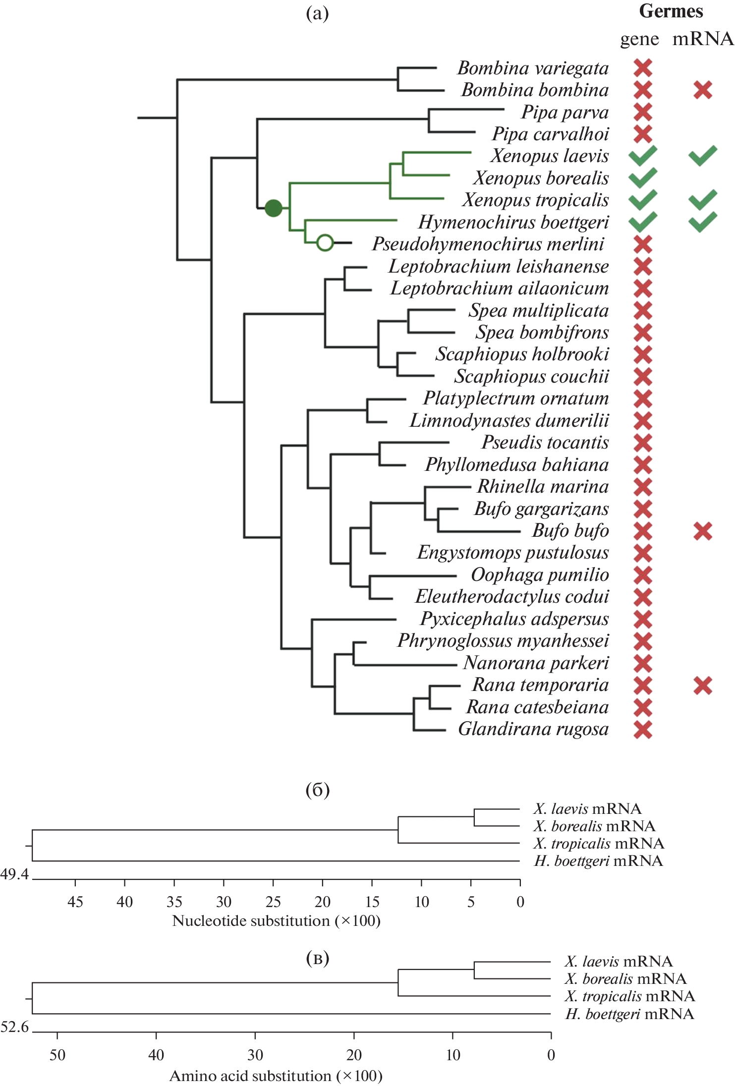 Ген germes – маркер половой плазмы и первичных половых клеток (ППК), описанный у шпорцевой лягушки Xenopus laevis. Известно, что оверэкспрессия его мутантной формы негативно влияет на формирование и миграцию ППК. Однако до сих пор не было известно, насколько широко этот ген представлен у животных разных филогенетических групп. В данной работе был проведен биоинформатический анализ геномных и транскриптомных последовательностей животных, имеющих половую плазму. Оказалось, что гомологи germes имеются только у представителей родов Xenopus и Hymenochirus семейства Pipidae (отряд Anura). Полученные результаты подтверждены путем ОТ-ПЦР-анализа экспрессии ортологов germes в яичниках шести представителей разных семейств Anura. Филогенетический анализ клонированных последовательностей гомологов germes говорит о появлении этого гена у предков Pipidae и вторичной его утрате в роде Pseudohymenochirus. Также показано, что аминокислотные последовательности функциональных доменов белка Germes в значительной степени консервативны.