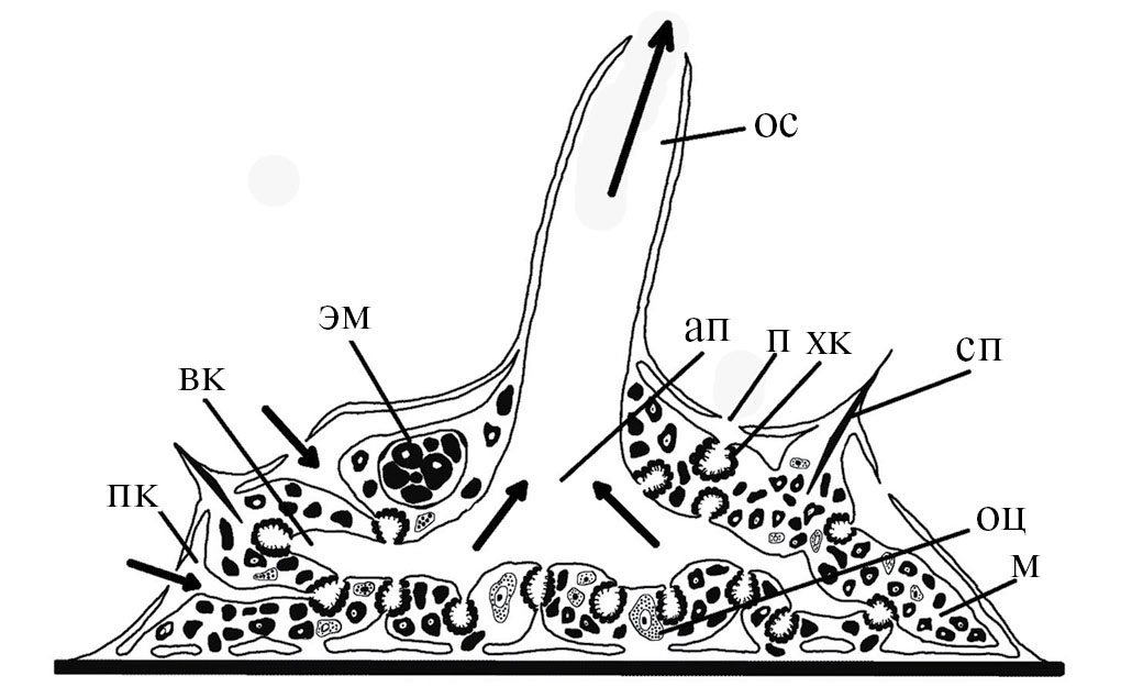 Рис. 1. Схема однооскулюмной губки, по Weissenfels, 1989, с изменениями. ап – атриальная полость, вк – выносящий канал водоносной системы, м – мезохил, ос – оскулум, оц – ооцит, п – пора, пк – приносящий канал водоносной системы, сп – спикула, хк – хоаноцитная камера, эм – эмбрион. Стрелками указано направление потока воды через тело губки.