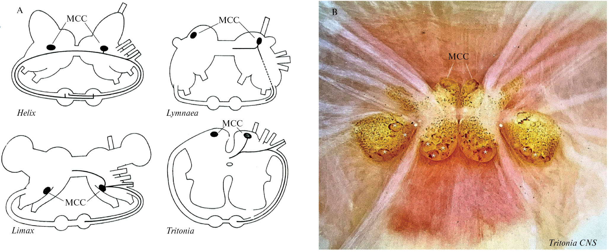 Рис. 2. A — MCC разных моллюсков, рисунок Сахарова (Сахаров, 1974); B — дорсальный вид живой центральной нервной системы Tritonia с гигантскими нейронами MCC; звездочками показаны некоторые другие гигантские нейроны; фото: Леонид Мороз.