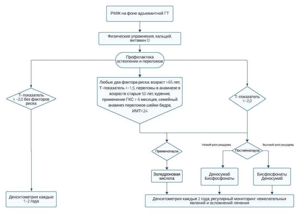 С целью медикаментозной профилактики и лечения остеопороза, развивающегося вследствие адъювантной ГТ, рекомендовано применение остеомодифицирующих агентов (бисфосфонатов и деносумаба) в течение 2−3 лет, далее по результатам денситометрии [9]. Для определения показаний к назначению антирезорбтивной терапии данной категории больных может быть рекомендован алгоритм, предложенный Lambertini и соавт. (рис. 1) [8].