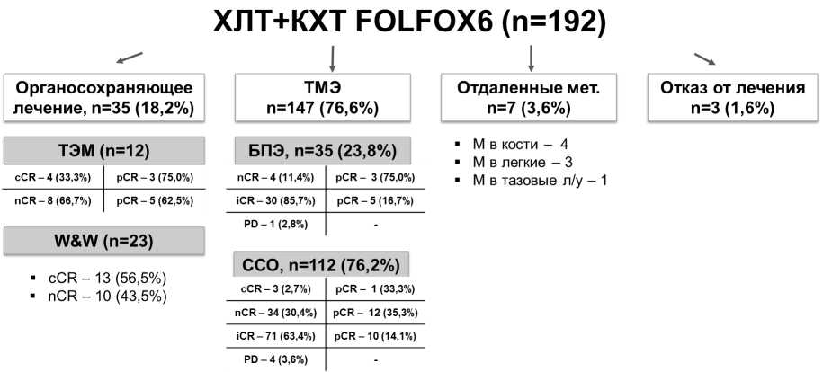 Контрольное обследование через 4 нед. после завершения последнего цикла КХТ являлось основным при определении дальнейшей тактики лечения. Оценку клинической регрессии опухоли проводили по совокупности данных МРТ, пальцевого исследования и эндоскопической картины. При оценке клинической регрессии опухоли использовали критерии эндоскопической и МРТ оценки опухолевого ответа на неоадъювантное лечение при РПК, предложенные N. Figuiredo и соавт. [12] и S.I. Felder и соавт. [13], модифицированные МРНЦ им. А.Ф. Цыба (табл. 1). При наличии полной клинической регрессии опухоли (cCR) — отсутствие первичной опухоли и ее метастазов в мезоректуме на МРТ (TRG1) и при эндоскопическом исследовании — больным предлагали активное динамическое наблюдение. При отсутствии cCR хирургическое лечение в объеме ТМЭ рассматривали как основной вариант лечения. При этом у пациентов с почти полным клиническим ответом (nCR) – TRG2-3 (yсT1-2N0) на МРТ, изъязвление или остаточная аденоматозная ткань на месте первичной опухоли при эндоскопии, как возможную опцию предлагали выполнение трансанального эндомикрохирургического (ТЭМ) иссечения стенки кишки. В случаях неполного ответа опухоли на лечение (iCR) или его отсутствия пациентам выполняли хирургическое вмешательство в ТМЭ.
