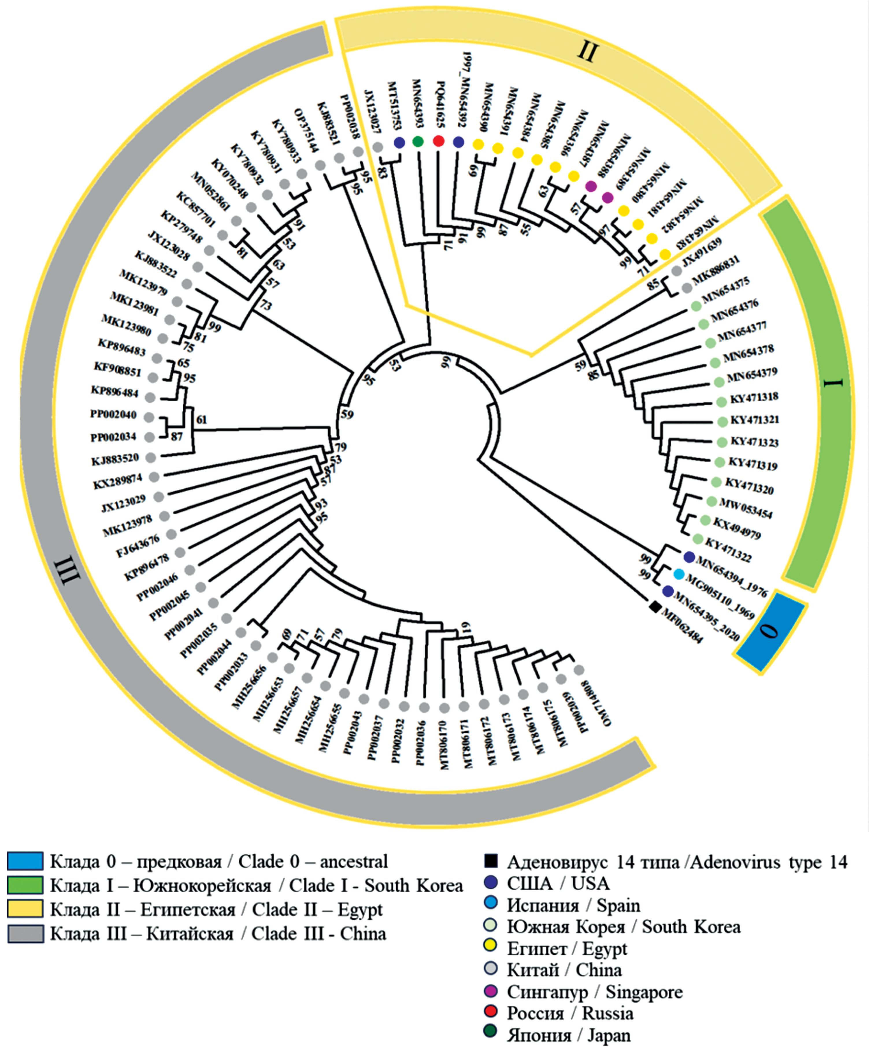 Results. The whole-genome sequencing of first isolated in Russia HAdV-55 was conducted. The sequence of isolate SCV3008:Ad55 was deposited in GenBank (Accession Number PQ641625). Unique mutations in the SCV3008:Ad55 genome were identified, one of which resulted in a conservative T29A substitution in the penton that did not affect its functions. Phylogenetic analysis showed clustering of SCV3008:Ad55 with isolates of clade II, which included representatives of 7 countries on different continents, indicating a wide distribution of HAdV-55. Isolates from endemic regions of China and South Korea formed separate clades. The study of microsatellite length polymorphism in untranslated regions of the genome became an additional tool for distinguishing closely related genomes.