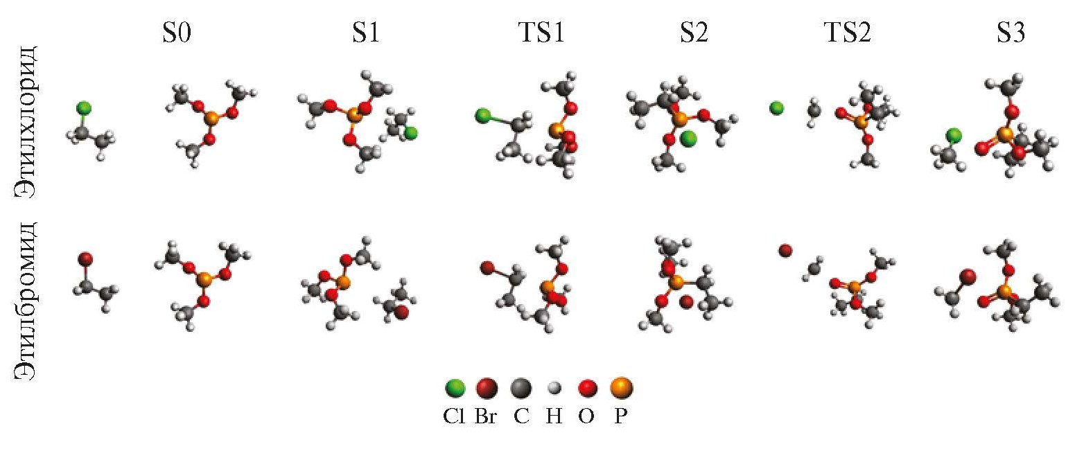 Для теоретического исследования реакции этилхлорида и этилбромида с триметилфосфитом были построены соответствующие структурные модели, и в рамках теории функционала плотности с использованием функционала B3LYP [21–23] проведено моделирование превращения реагентов в фосфонат и соответствующий метилгалогенид. Показано, что реакция протекает в 2 стадии. Атом фосфора, входящий в состав триметилфосфита, имеет неподеленную электронную пару, которая на первой стадии взаимодействия атакует субстрат – алкилгалогенид, в результате чего получает подвижность галогенид-ион, который становится хорошей уходящей группой. На второй стадии реакции происходит атака галогенид-ионом одной из метоксигрупп фосфониевой соли с образованием метилгалогенида и упрочнением связи между кислородом и фосфором (что является энергетически выгодным также по причине особого свойства фосфора – оксигенофильности) во втором ожидаемом продукте – фосфонате. Стадии изучаемой реакции представлены на схеме 1, а структура соответствующих реагентов, переходных состояний, продуктов и интермедиатов – на рис. 2.