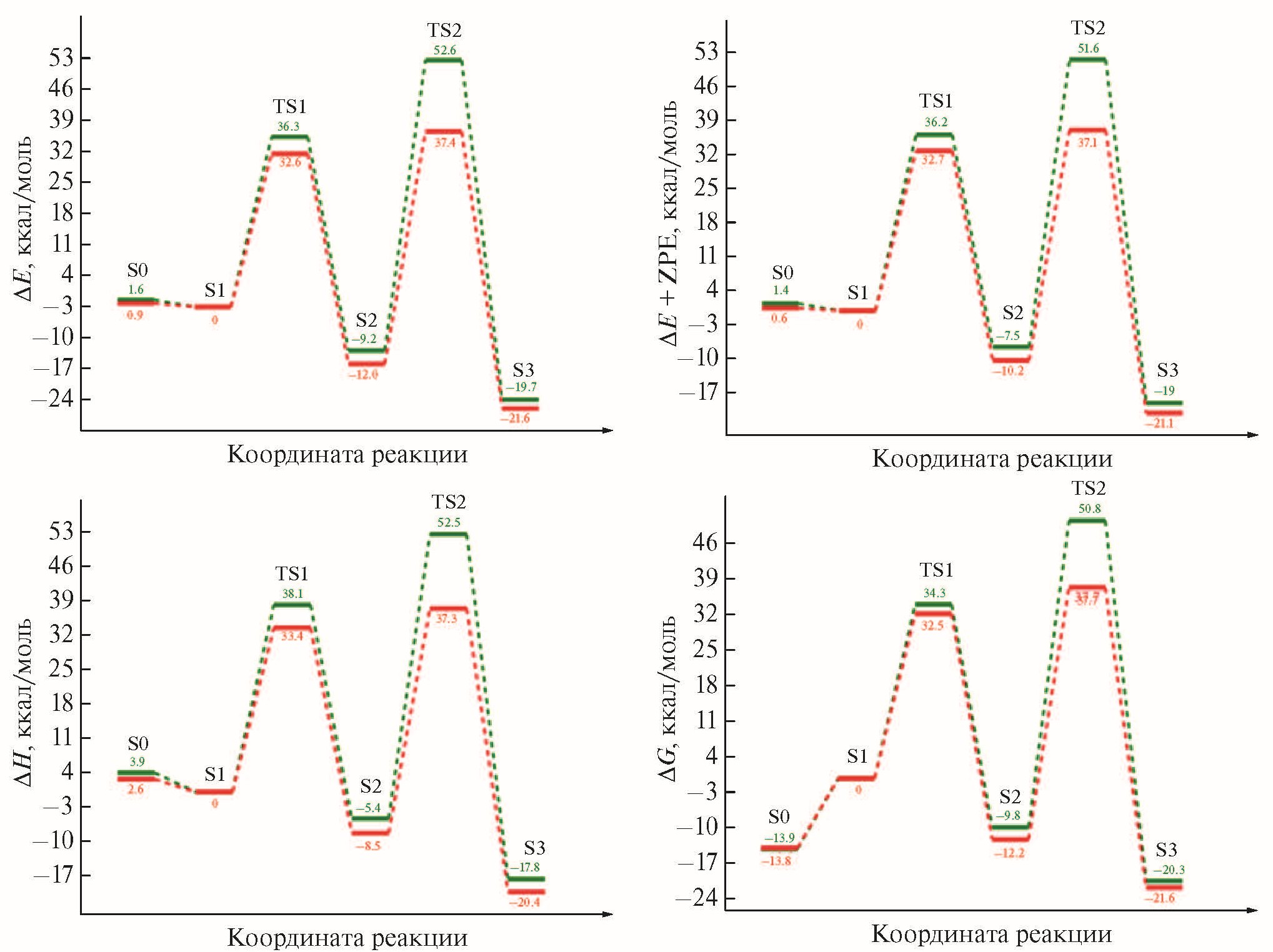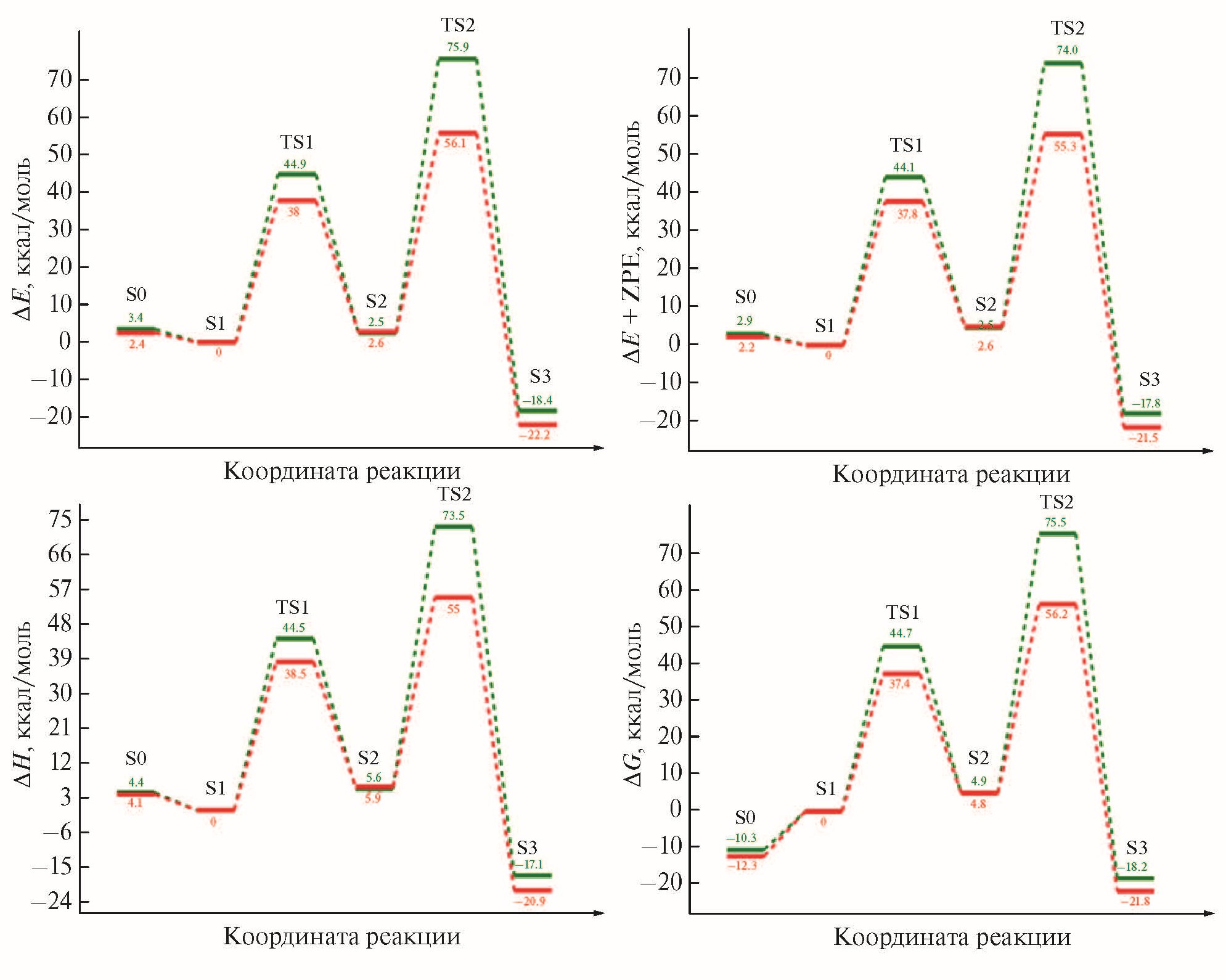 Рис. 5. Энергетические профили реакции Арбузова, осуществляемой в газовой фазе. Здесь и на рис. 6 зеленым цветом обозначен реакционный путь для хлорэтана, красным – для бромэтана