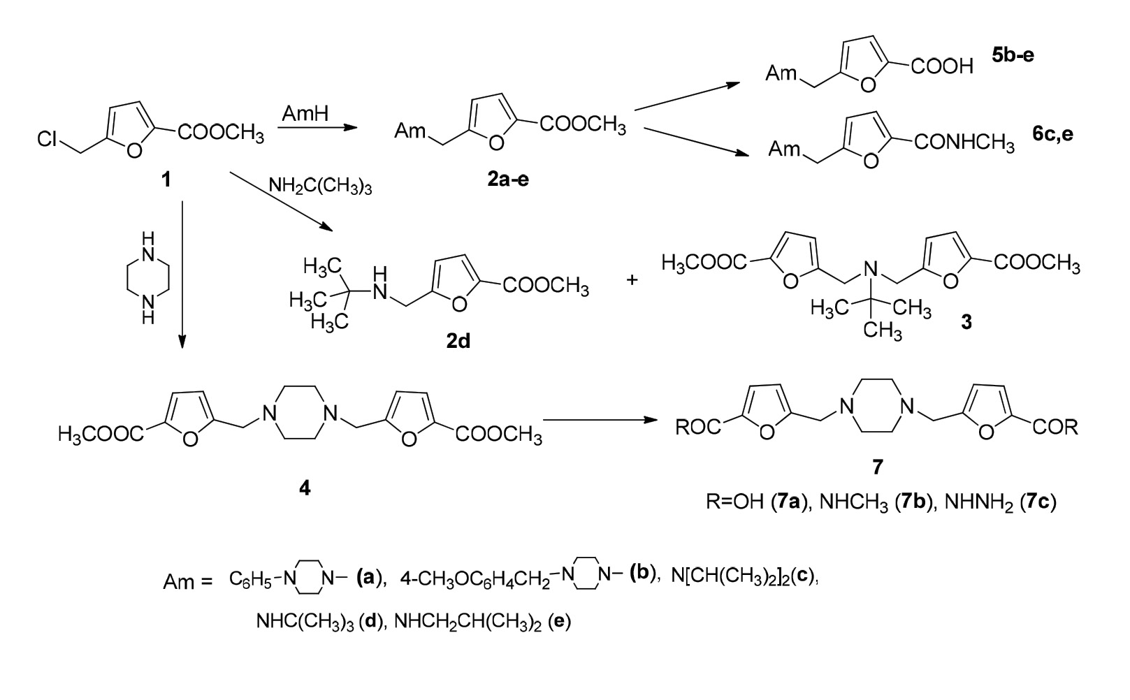 Для синтеза намеченных структур в качестве ключевого соединения нами использован метиловый эфир 5-хлорметилфуран-2-карбоновой кислоты (1), который вводили в реакцию с втор-бутил-, трет-бутил- и диизопропиламинами, а также с пиперазином и замещенными пиперазинами (фенилпиперазин и 4-метоксибензилпиперазин). В результате получены кристаллические аминоэфиры 2а,b и маслообразные аминоэфиры, охарактеризованные в виде гидрохлоридов 2с–е. В случае трет-бутиламина, наряду с монозамещенным продуктом 2d, было выделено дизамещенное производное 3, в ЯМР 1Н спектре которого проявляются сигналы 9 протонов трет-бутильной группы в области 1.50 м.д., 6 протонов 2 метоксильных групп при 3.84 м.д. и 4 протонов 2 метиленовых групп при 4.41 м.д. Конденсация хлорметилфурана 1 с пиперазином также приводит к дизамещенному производному 4. Далее синтезированные эфиры 5-замещенных фуран-2-карбоновых кислот 2b–e и диэфир 4 гидролизом были переведены в кислоты 5b–e и дикислоту 7a, а реакцией эфиров 2c,e и 4 с метиламином (схема 1) – в соответствующие N-метиламиды 6c,e и диамид 7b.