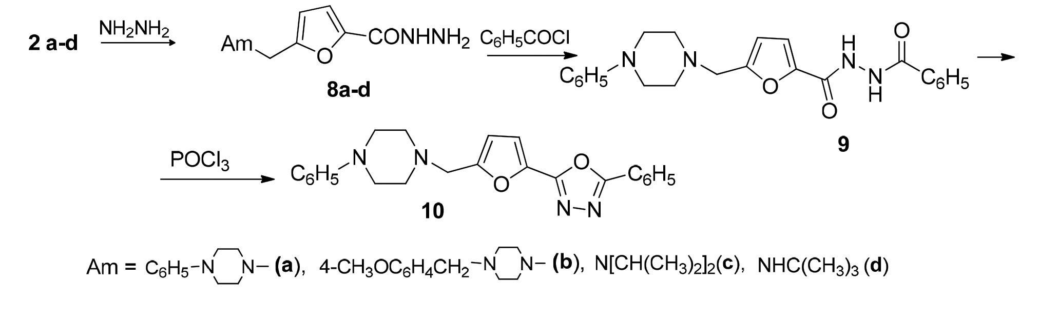 С целью получения гетероцикличекой системы, в которой фурановое кольцо непосредственно связано с ядром 1,3,4-оксадиазола, осуществлен синтез соответствующих гидразидов. Реакцией эфирoв 2а–d и 3 с гидразин-гидратом получены гидразиды 8а–d и 7с. Гидразид 8a взаимодействием с бензоилхлоридом переведен в дибензоилзамещенный гидразин 9, циклизованный действием хлорокиси фосфора в 5-пиперазинилметилзамещенный оксадиазолилфуран 10 (схема 2).