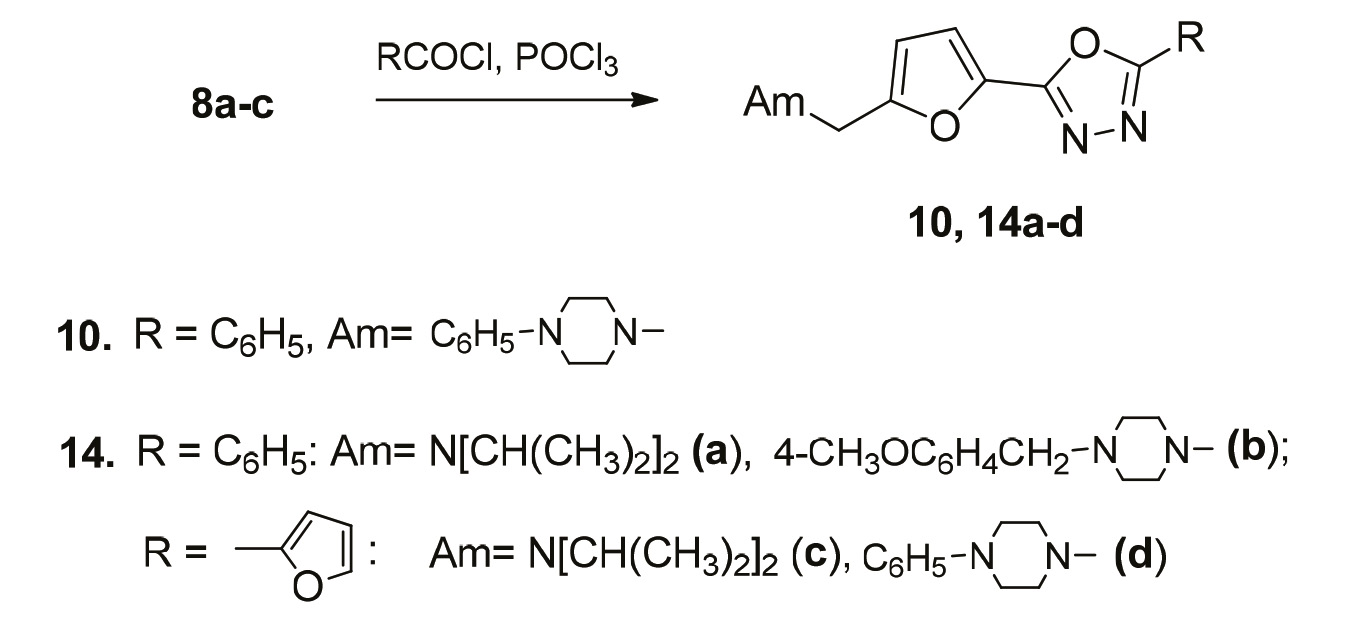 Нами исследована также возможность перехода к бисгетероциклической системе оксадиазолилзамещенного фурана в одну стадию без выделения амидных производных. С этой целью гидразиды 8а–с введены в реакцию с хлорангидридами бензойной и фуранкарбоновой кислот в среде толуола с одновременным добавлением хлорокиси фосфора. В результате были выделены оксадиазолилзамещенные фураны 10 и 14а–d с выходом 50–60% (схема 4).
