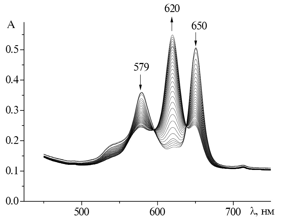 Предварительно установлено, что в среде инертного бензола электронный спектр поглощения (ЭСП) H2Pa(C6H3F2)8 имеет в видимой области 2 расщепленные Qх- и Qy- составляющие Q-полосы с λI = 650 и λII = 579 нм соответственно, что указывает на D2h-симметрию молекулы (рис. 1). В среде протоноакцепторного пиперидина (н-бутиламина) расщепление Q-полосы исчезает в результате повышения симметрии молекулы от D2h до D4h (рис. 1). Этот факт свидетельствует о том, что H2Pa(C6H3F2)8 проявляет свойства двухосновной NH-кислоты и образует с основаниями устойчивые во времени комплексы с переносом протонов. На это указывает характер ЭСП H2Pa(C6H3F2)8 в пиперидине (н-бутиламине), который не претерпевает изменений в течение ~57 ч при температуре 333 К (рис. 1).