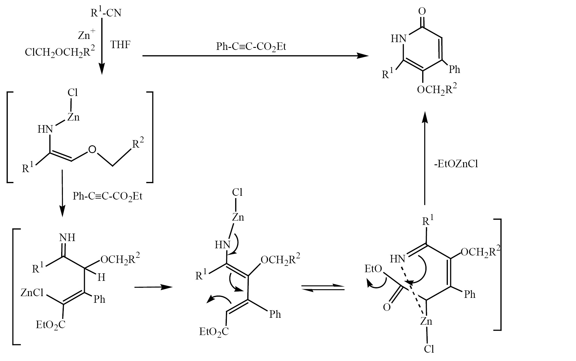 Таким образом, впервые разработали эффективный, одностадийный синтез пиридон-2(1Н)-онов через тандемную реакции нитрилов с пропиолатами. Эта метод позволяет прямое использование нитрилов, а также обеспечивает синтез пиридинонов-2(1Н)-онов .с разнообразными заместителями кольце.