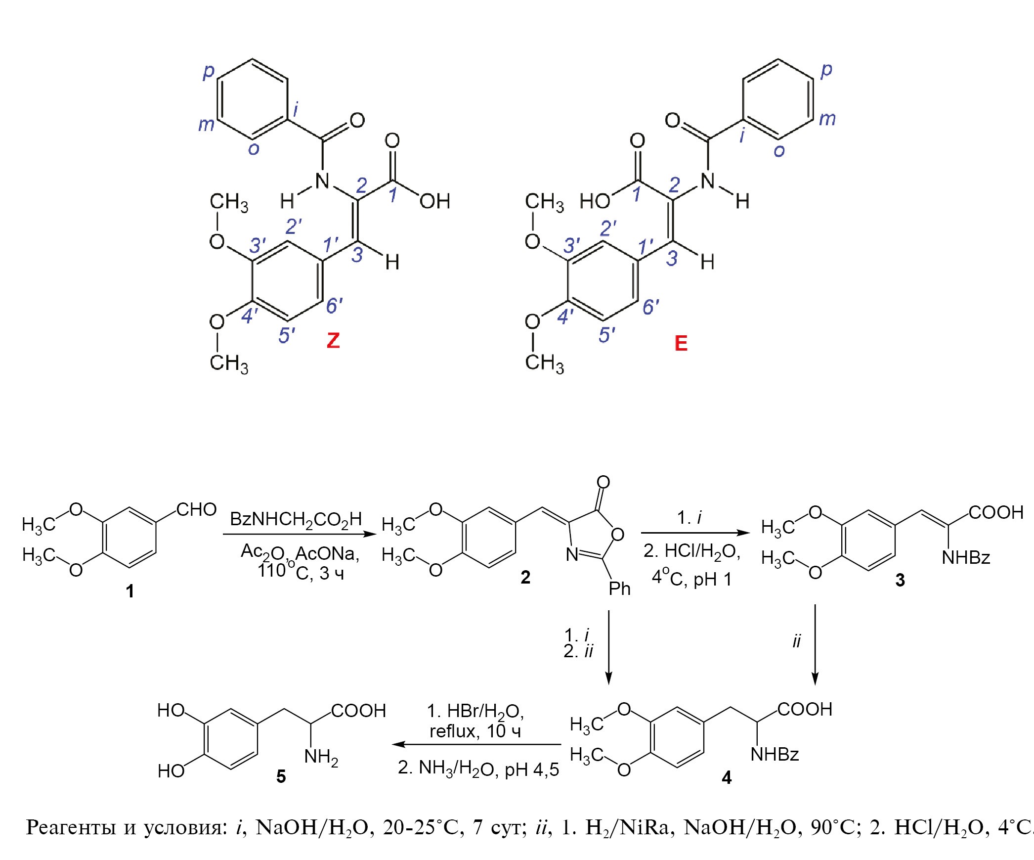 Разработан удобный и эффективный препаративный метод синтеза 2-амино-3-(3,4-дигидроксифенил)пропановой кислоты из коммерчески доступных и устойчивых соединений, который может быть реализован в три стадии на стандартном как лабораторном, так и промышленном оборудовании с общим выходом 59%. Установлено, что гидролиз 4-(3,4-диметоксибензилиден)-2-фенилоксазол-5(4H)-она и его восстановление до 2-бензамидо-3-(3,4-диметоксифенил)пропановой кислоты сплавом Ренея могут быть осуществлены в одну стадию с выходом 90%. При гидролизе 4-(3,4-диметоксибензилиден)-2-фенилоксазол-5(4H)-она с выходом 68% выделена (Z)-2-бензамидо-3-(3,4-диметоксифенил)акриловая кислота, существующая в твердом виде по данным рентгеноструктурного анализа в виде Z-изомера, а в растворе ДМСО-d6 в виде смеси Z- и Е-изомеров в соотношении 82:18.