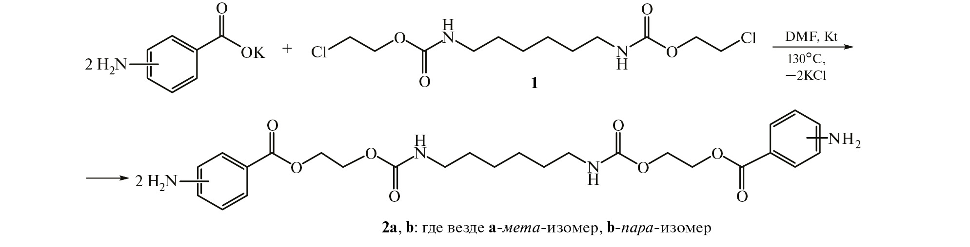 Известно, что для синтеза функционально замещенных моно- и бисмалеимидоаренкарбоновых кислот используются 2 подхода. Один из них заключается в применении реакций хлорангидридов малеимидосодержащих кислот с нуклеофильными реагентами (спирты и амины) [20, 21], а второй – в алкилировании калиевых солей малеимидобензойных кислот соответствующими моно- и дигалогенидами [21, 22]. К недостаткам этих методов можно отнести труднодоступность исходных малеимидосодержащих кислот. В данном сообщении с целью упрощения процесса получения новых рядов бисмалеинимидов, содержащих в своем составе сложноэфирные и уретановые группы, в качестве исходного галогенида предложено использовать легкодоступный бис(2-хлорэтил)гексан-1,6-диилдикарбамат (1), который является продуктом реакции гексаметилендиизоцианата с 2-хлорэтанолом [23]. На основе этого дихлорида взаимодействием с калиевыми солями м- и п-аминобензойных кислот были синтезированы бис{2-[3(4)-аминофенилкарбонилокси]этил}гексан-1,6-диилдикарбаматы 2a,b. Процесс проводили в среде диметилформамида (ДМФА) при температуре 130–140оС в присутствии катализатора – триэтилбензиламмония хлорида (ТЭБАХ). Контроль за ходом реакции и чистотой образующихся соединений осуществляли методом ТСХ. Образующиеся соединения в виде светло-коричневых кристаллов выделяли с высоким выходом (92–97%) осаждением десятикратным количеством воды (схема 1).
