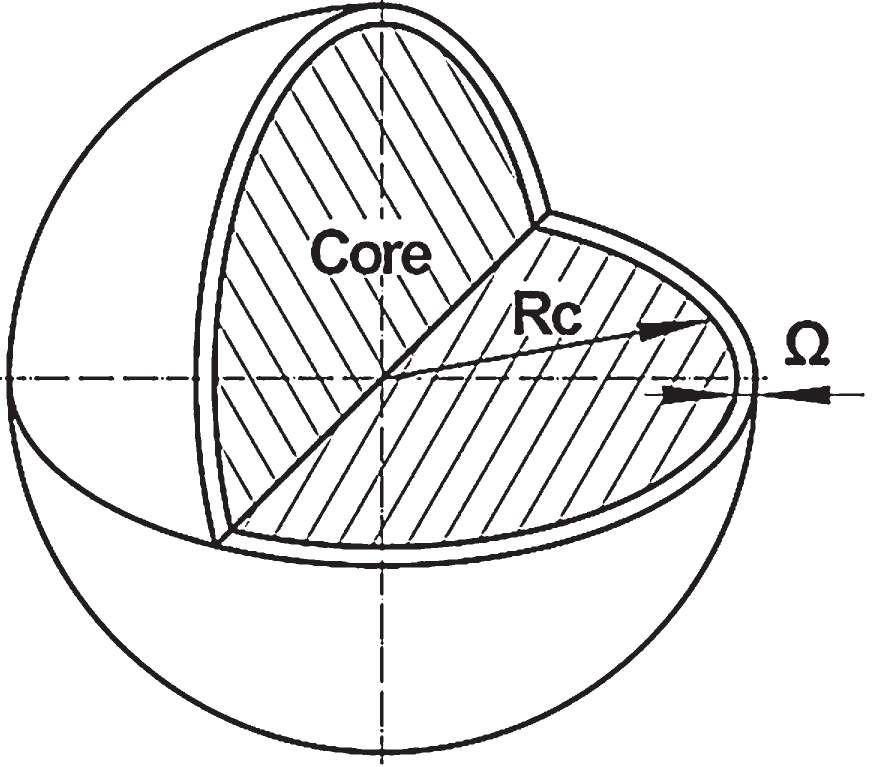 В первом приближении такое трехмерное ядро и поверхностная оболочка наночастицы физико-механически изотропны и однородны, т. е. в модели ядро–оболочка наночастицу можно принимать как недеформируемую “чистую” частицу, в которой ядро имеет первоначальный радиус , а поверхностная оболочка имеет первоначальную толщину Ω0.