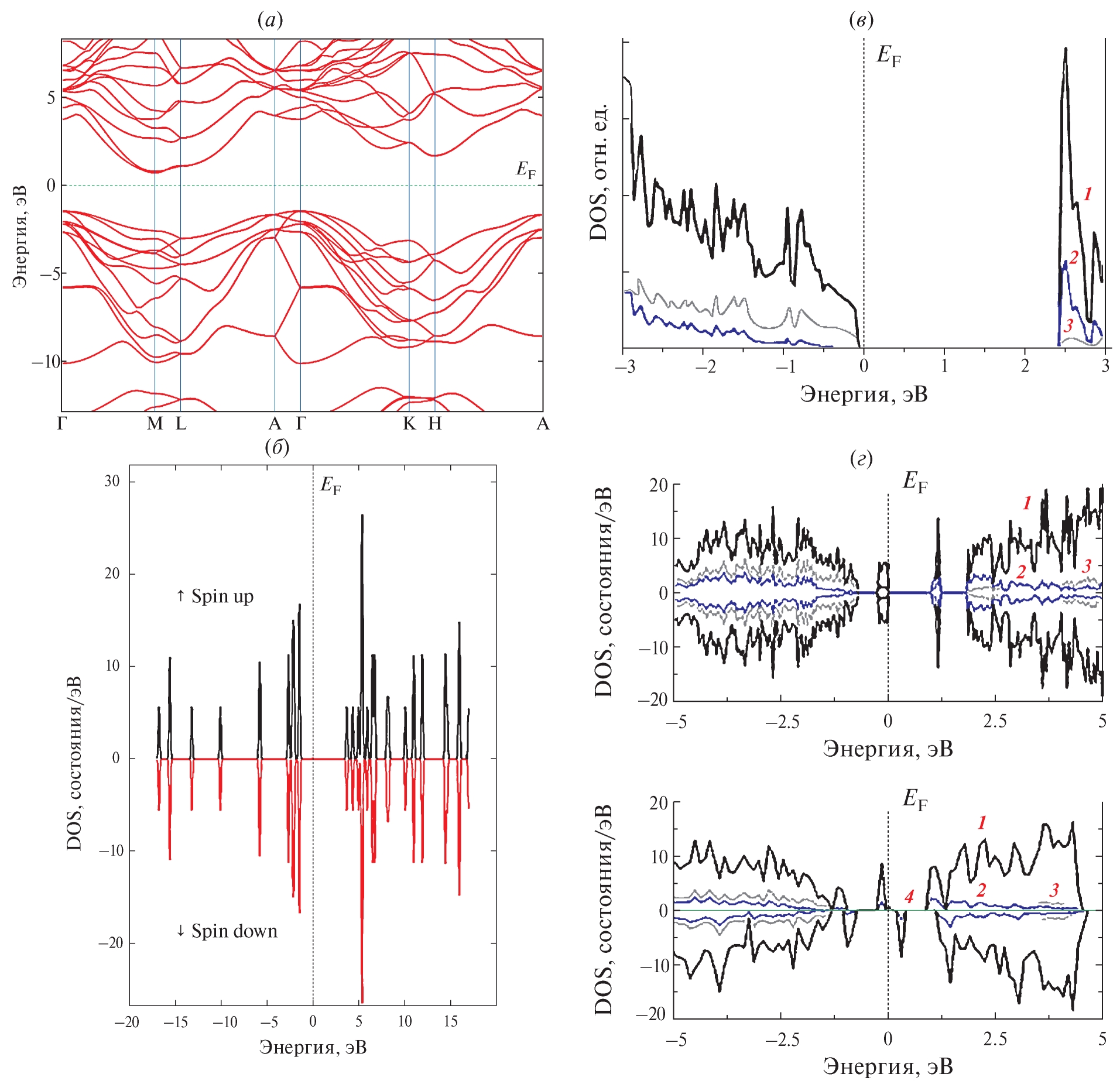 Равновесное состояние структуры 4H−SiC ⟨Liads⟩ определяется перераспределением заряда в основном между атомами Si и углерода C из-за орбитальной гибридизации атомов. Происходит перенос электронов лития в выгодную адсорбционную область (Н-сайт), в 4H–SiC–Liads, где расстояния между Liads и атомами 4H–SiC уменьшаются. Абсорбция Liads сдвигает пики электронной плотности (DOS) суперъячейки 4H−SiC ⟨Liads⟩ относительно уровня Ферми EF чуть вправо. Такой сдвиг в DOS означает, чтоLiads передает часть электронов в 4H–SiC и за счет этого энергетические состояния атомов слабо смещаются.