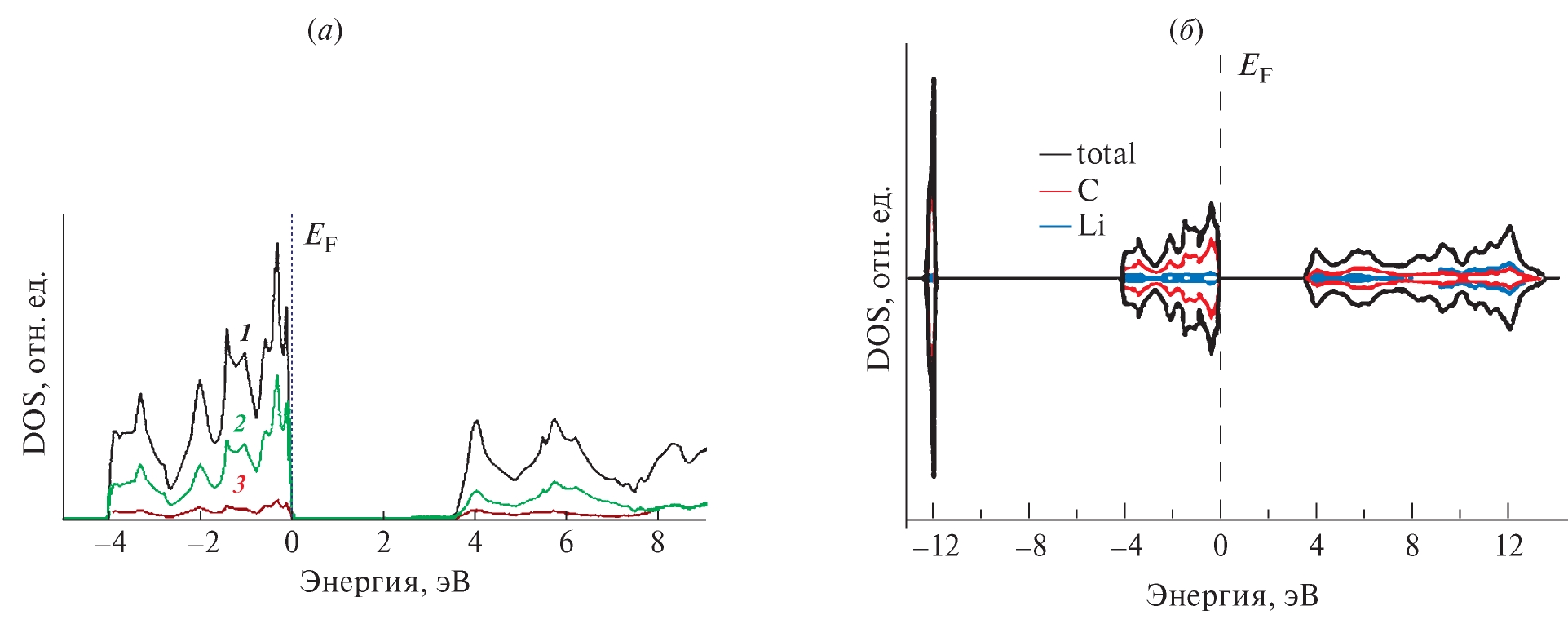 Парциальные вклады PDOS орбиталей как лития, так и углерода формируют плотность состояний атомов в широкозонном α-Li2C2 = 3.2 эВ). Спектр PDOS α-Li2C2 характеризуется пиками гибридизированных атомных орбиталей углерода C2s-2p (sp1), где C2s-состояния соответствуют в основном отрицательным энергиям. Углеродные 2p-состояния располагаются вблизи уровня Ферми. В α-Li2C2 спин вверх и спин вниз состояния DOS симметричны и локальный магнитный момент не обнаружен. В полном DOS соединения LiSi очень узкая запрещенная зона не обнаруживается, хотя по экспериментальным данным LiSi имеет запрещенную зону 0.057 эВ. Отсутствие Eg в LiSi связано с s-p-гибридизацией, приводящей к тетраэдрической структуре sp3. Энергии 1s22s1 состояний лития в спектре DOS LiSi незначительные. Присутствие Li в фазе LiSi снижает степень s-p-гибридизации.