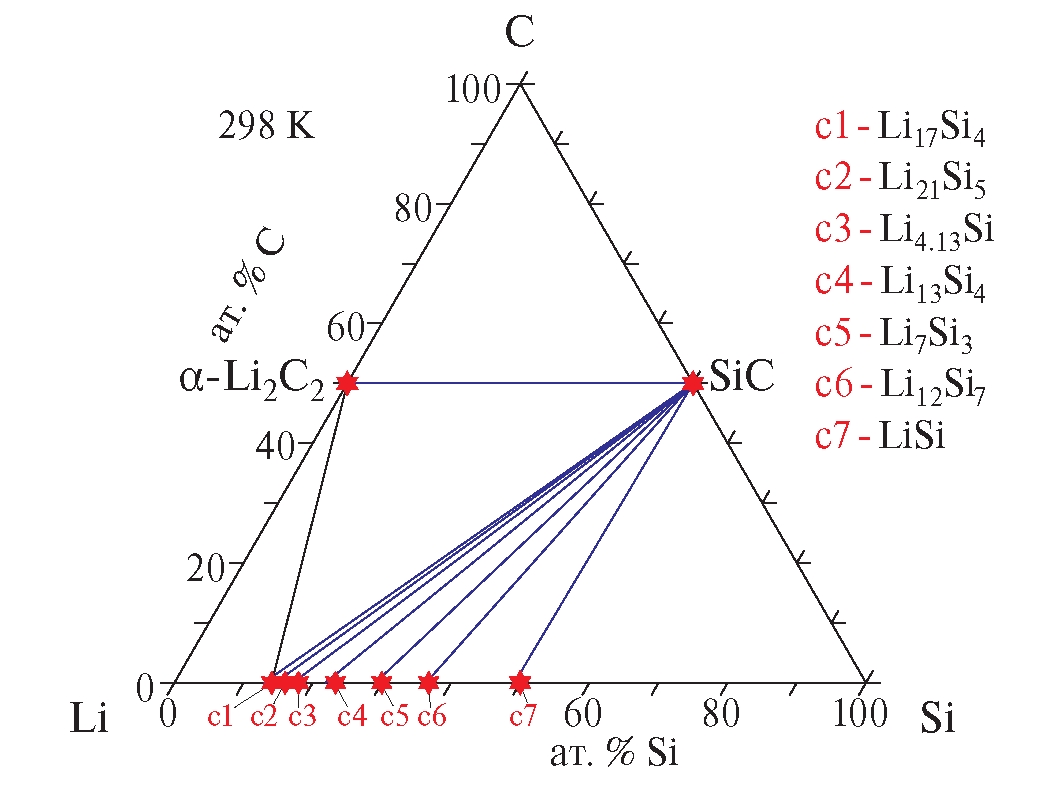 Фазовые равновесия, термодинамические свойства и структура бинарных и некоторых тройных сплавов системы Si–C–Li изучены ранее [5–8]. Структура, состав и свойства материалов электрода сильно влияют на характеристики LIB.