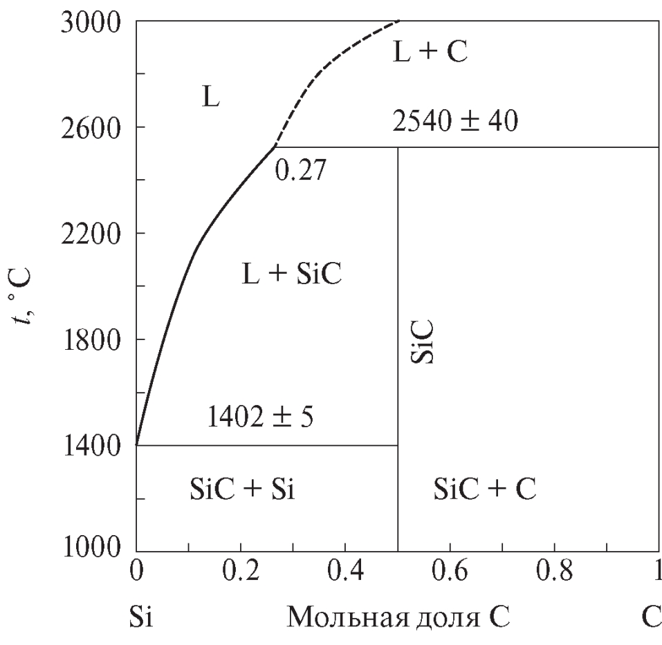 Из T − x фазовой диаграммы Si–С следует, что в стандартных условиях только стехиометрический состав SiС является стабильной структурой (рис. 15) [56].