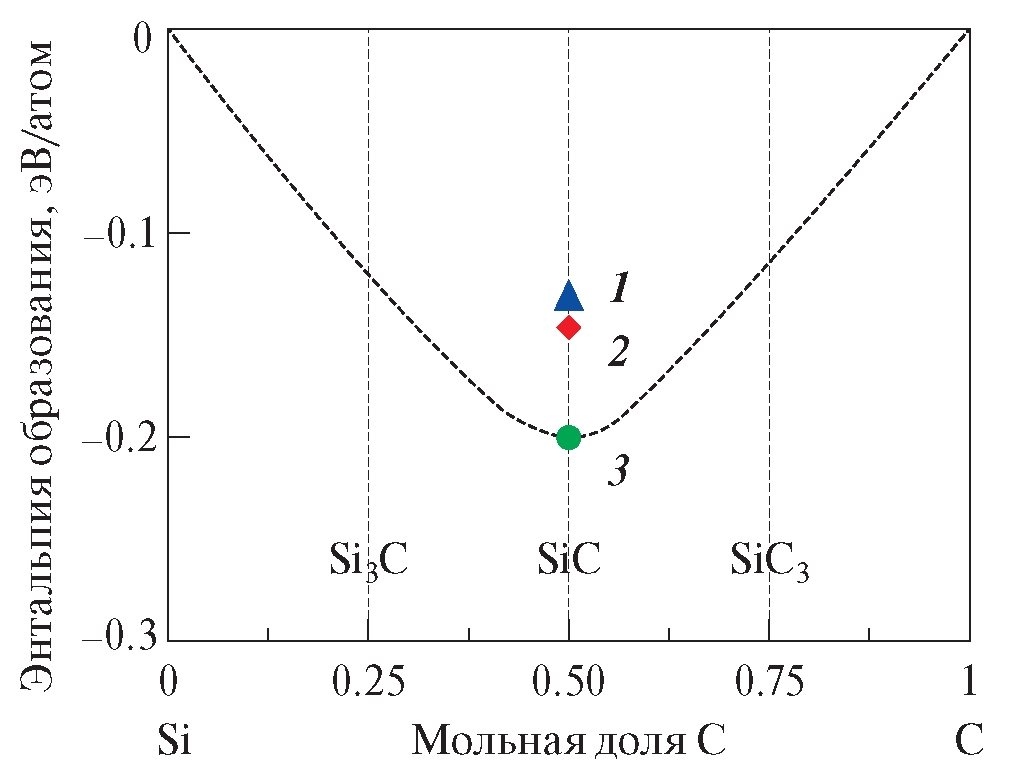 Рис. 16. DFT расчетная концентрационная зависимость энтальпии образования бинарных фаз системы Si–C: 1 – наш DFT расчет; 2 – [58]; 3 – [57].