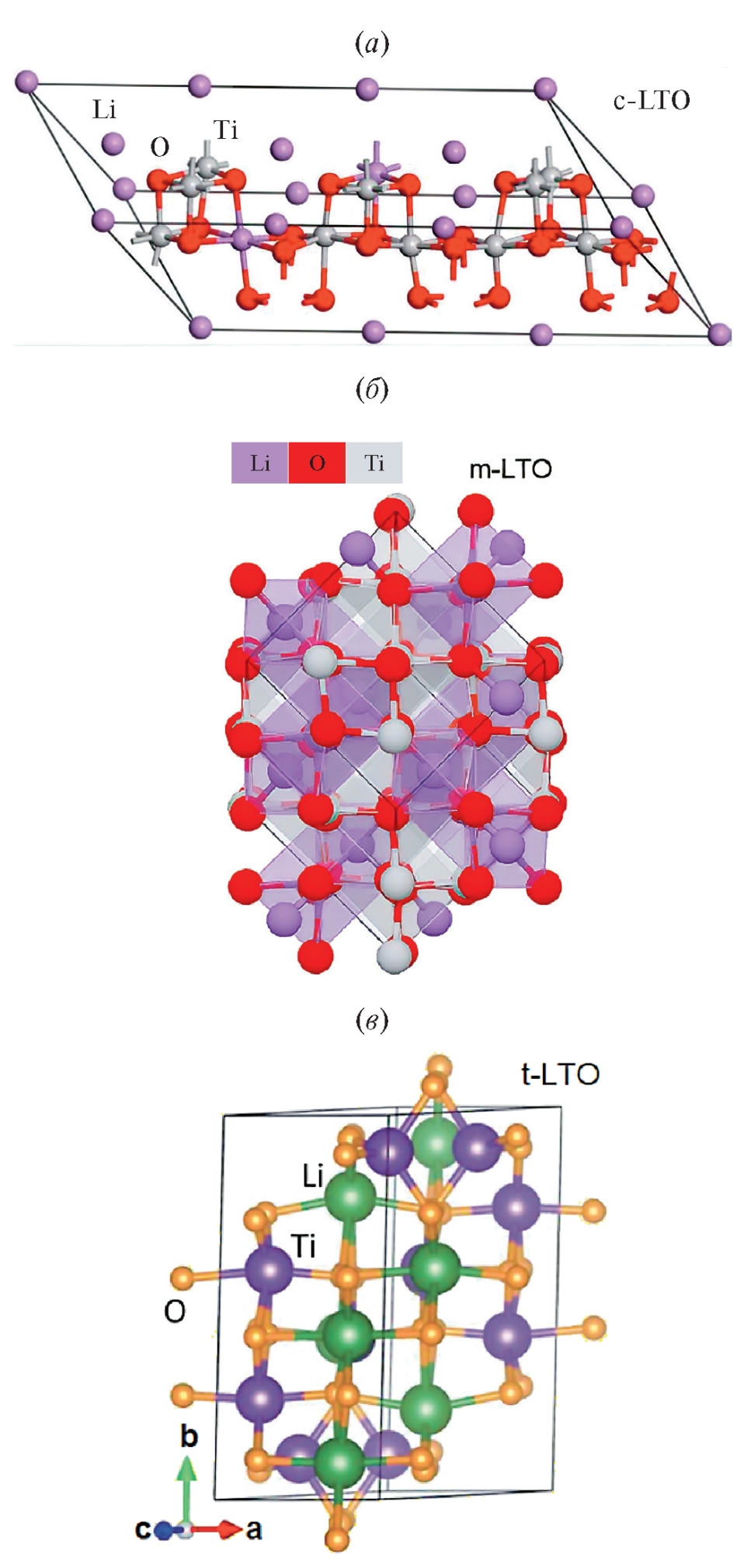 Рис. 1. Кристаллическая структура Li4Ti5O12 (LTO): а — кубическая модификация шпинели c-LTO; б — моноклинная модификация m-LTO; в — триклинная модификация t-LTO.