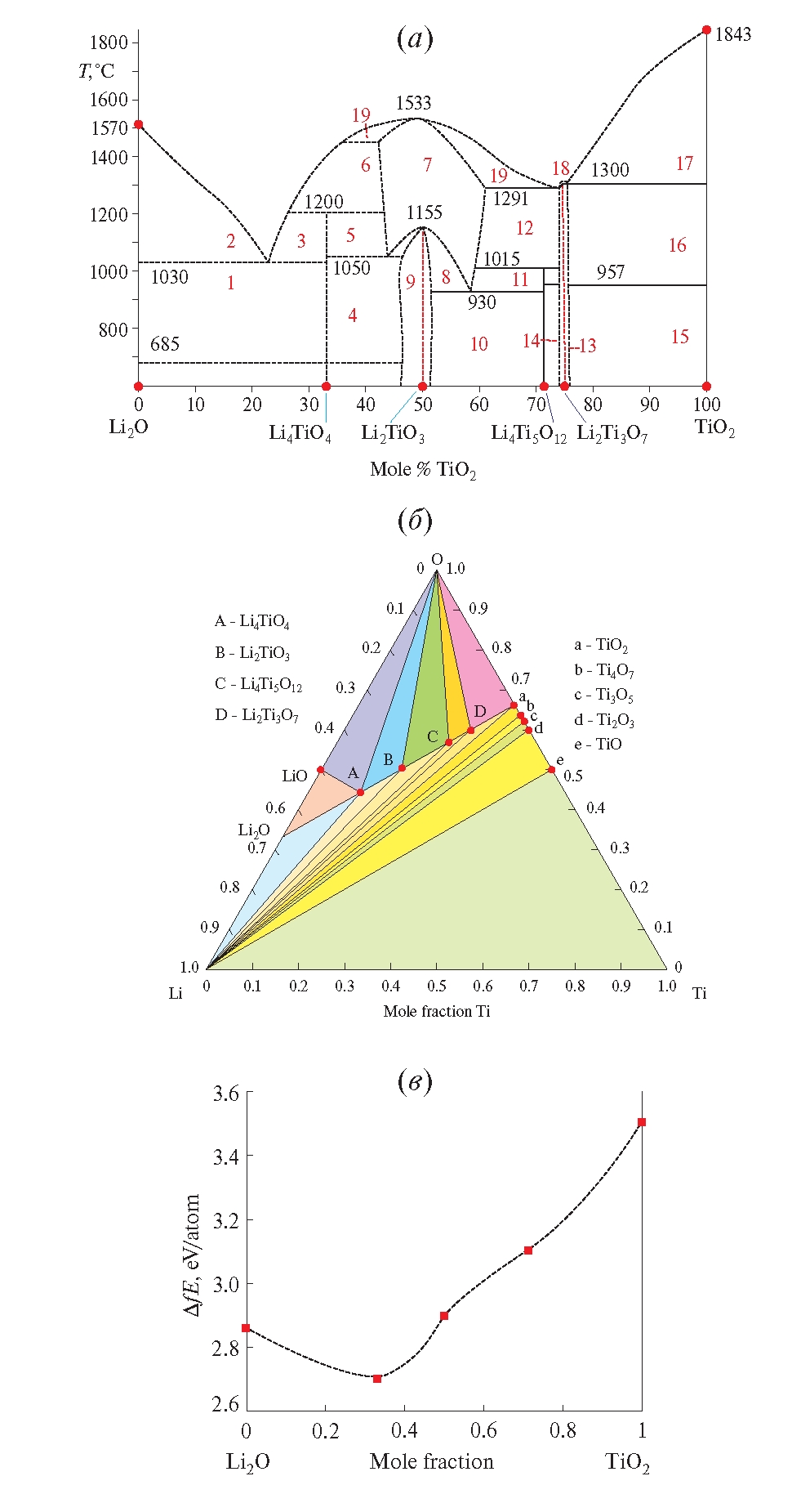 Рис. 2. Уточненная нами фазовая диаграмма (а) системы Li2O–TiO2: 1 — Li2O + Li4TiO4; 2 — Li2O + L (жидкость); 3 — L + Li4TiO4; 4 — Li4TiO4 + β-Li2TiO3 (ss), где ss — твердые растворы; 5 — Li4TiO4 + γ-Li2TiO3 (ss); 6 — L + γ-Li2TiO3 (ss); 7 — γ-Li2TiO3 (ss); 8 — γ-Li2TiO3 (ss) + β – Li2TiO3; 9 — β-Li2TiO3 (ss); 10 — β-Li2TiO3 (ss) + Li4Ti5O12 (LTO); 11 — γ-Li2TiO3 (ss) + (LTO); 12 — γ-Li2TiO3 (ss) + Li2Ti3O7; 13 — Li2Ti3O7; 14 — β-Li2Ti3O7 (ss) + LTO; 15 — β-Li2Ti3O7 (ss) + TiO2; 16 — γ-Li2Ti3O7 (ss) +TiO2; 17 — L + TiO2; 18 — γ-Li2Ti3O7 (ss) + L; 19 — γ-Li2TiO3 (ss) + L; предварительно построенное нами изотермическое сечение (б) системы Li–Ti–O при 298 К; концентрационная зависимость энергии образования тройных соединений (в) в системе Li2O–TiO2. Рассчитанные значения ∆fE для фаз Li4TiO4, Li2TiO3, Li4Ti5O12 лежат на выпуклой оболочке и термодинамически устойчивы.