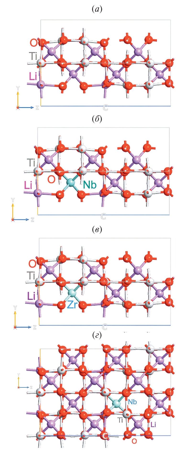 Рис. 3. Атомная структура с моноклинной структурой m-LTO–M: а — суперъячейка m-LTO; б — суперъячейка m-LTO–Zr; в — суперъячейка m-LTO–Nb; г — конвекционная суперъячейка m-LT–Nb.