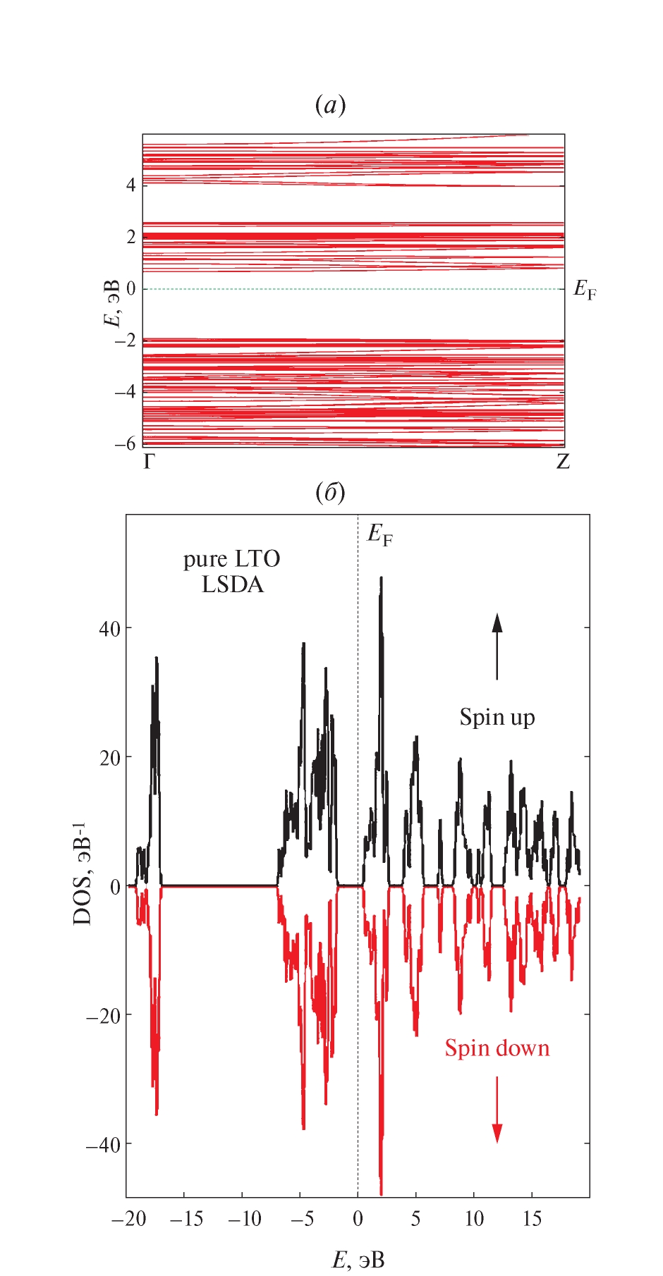 Рис. 4. Зонная структура суперъячейки m-LTO (а); DOS суперъячейки m-LTO (б). Энергия Ферми установлена равной 0 эВ.