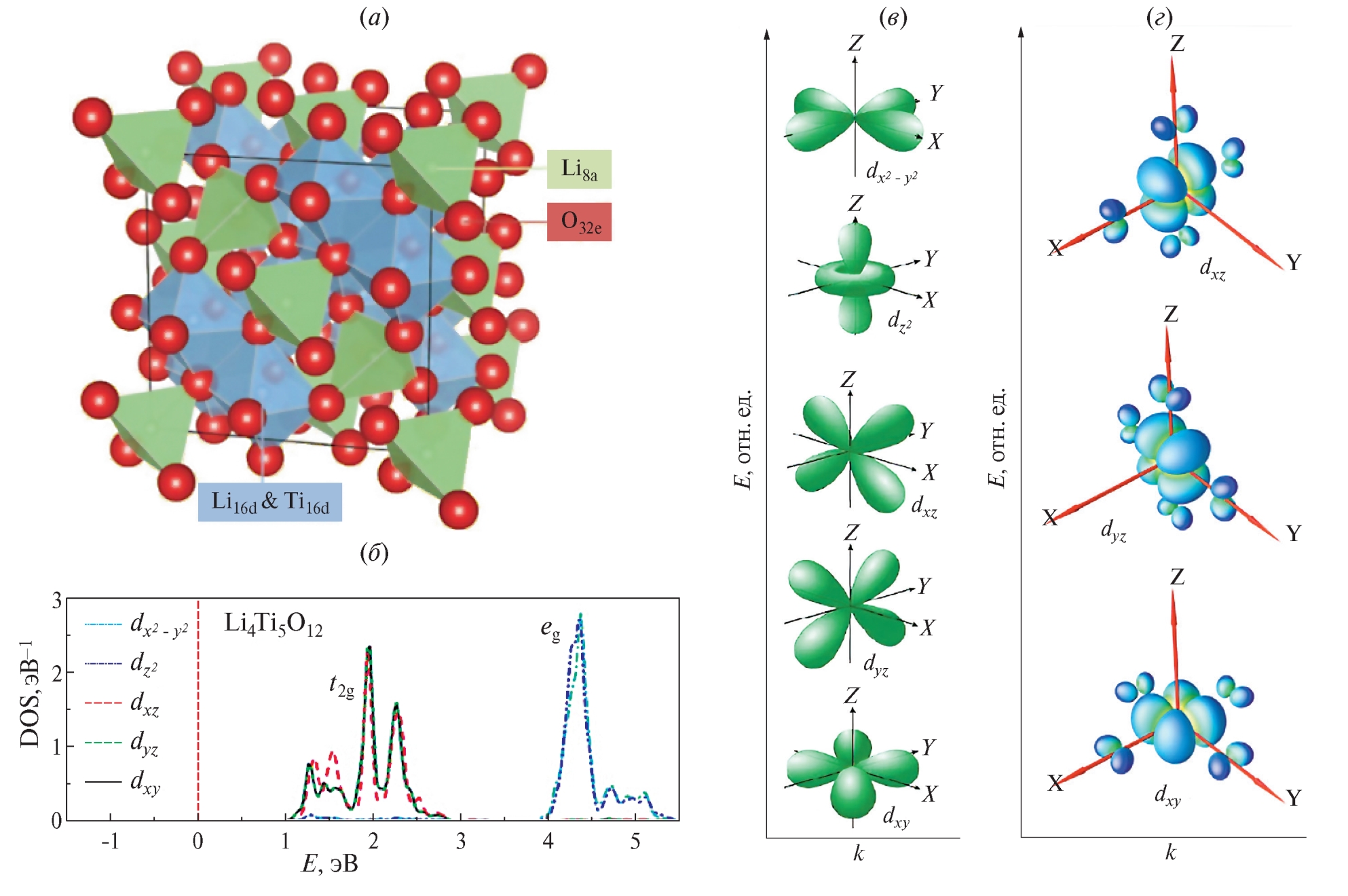 Рис. 5. Элементарная ячейка Li4Ti5O12 с кубической структурой (а), где зеленые тетраэдры и зеленые октаэдры — ионы Li в позиции 8a, синие октаэдры — ионы Li и Ti в позиции 16d, красные сферы — ионы кислорода в позиции 32e [21]; атомная проекция плотности состояний атома Ti в c-LTO (б), рассчитанная с помощью DFT GGA суперячейки 1 × 1 × 3 [22]; пять d-орбиталей атома (в), имеющих разную трехмерную ориентацию. Орбитали расположены на схеме по мере возрастания их энергии; схема Ti-3d (t2g) орбиталей атома титана в LTO (г). Орбитали расположены на диаграмме по мере увеличения их энергии.