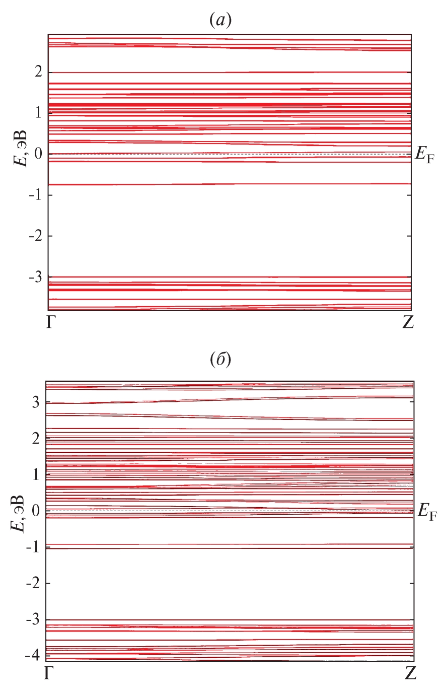 Рис. 6. Зонные структуры 2 × 2 × 2 легированных суперъячеек m-LTO—Zr (Nb) с моноклинной структурой, рассчитанные методом DFT LSDA: а — суперъячейка m-LTO—Zr; б — суперъячейка m-LTO—Nb. Энергия Ферми установлена равной 0 эВ по шкале энергий.