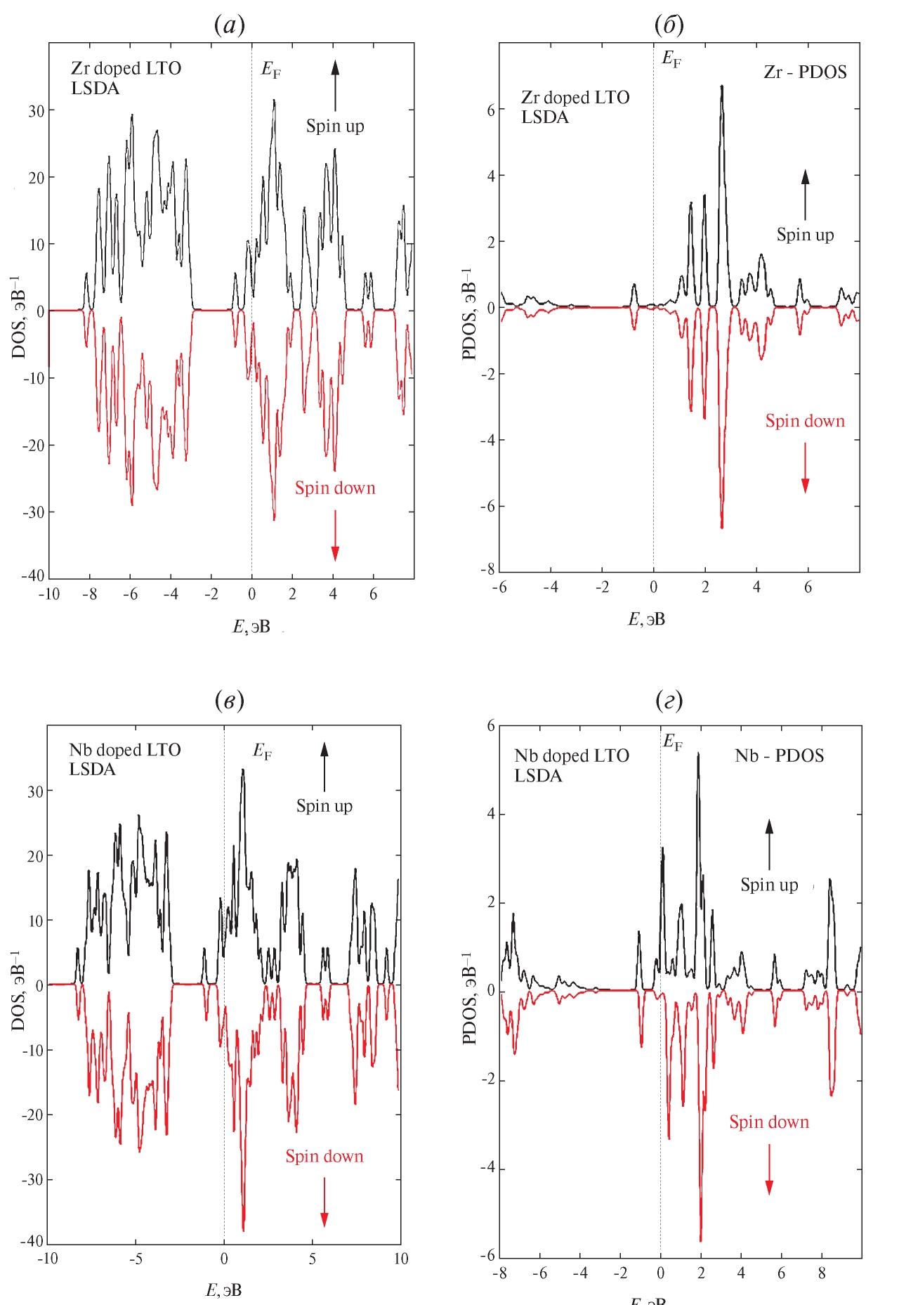 Допинг улучшает стабильность кристаллической структуры и электрохимические характеристики анода m-LTO–M. Это связано с меньшим ионным радиусом Zr4+ или Nb3+ (Zr4+, r = 0.72 Å; Nb3+, r = 0.72 Å) по сравнению с ионом Li+ (0.76 Å). Кроме того, легирование Zr4+ или Nb3+ может генерировать кислородные вакансии для поддержания электронного нейтралитета в структуре. В этом случае стабильность LIB во время цикла зарядки/разрядки обычно увеличивается. Электронный перенос m-LTO–M также зависит от свойств ионных центров Ti3+–Ti4+. Следовательно, донорные примеси электронов могут улучшить проводимость. Такое легирование может обеспечить ионы Ti4+ с дополнительными электронами. В спектре DOS меняется положение уровня Ферми и новыe состояния в запрещенной зоне не образуются.