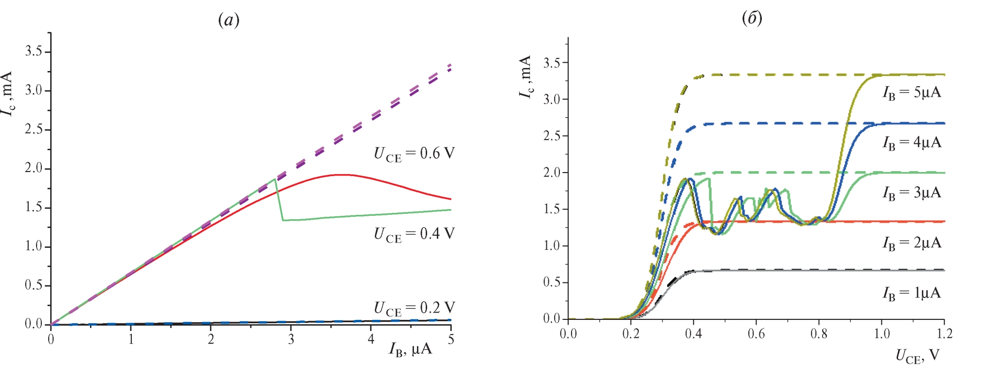 Рис. 3. Семейство передаточных вольт-амперных характеристик биполярного транзистора (а): (– — -) — без сверхрешетки; (―) — со сверхрешеткой в эмиттерном переходе. Напряжение коллектор—эмиттер UCE составляет 0.2, 0.4 и 0.6 В; семейство выходных вольтамперных характеристик биполярного транзистора (б): (– — -) — без сверхрешетки; (―) — со сверхрешеткой в эмиттерном переходе. Ток базы IВ равен 1–5 мкА.