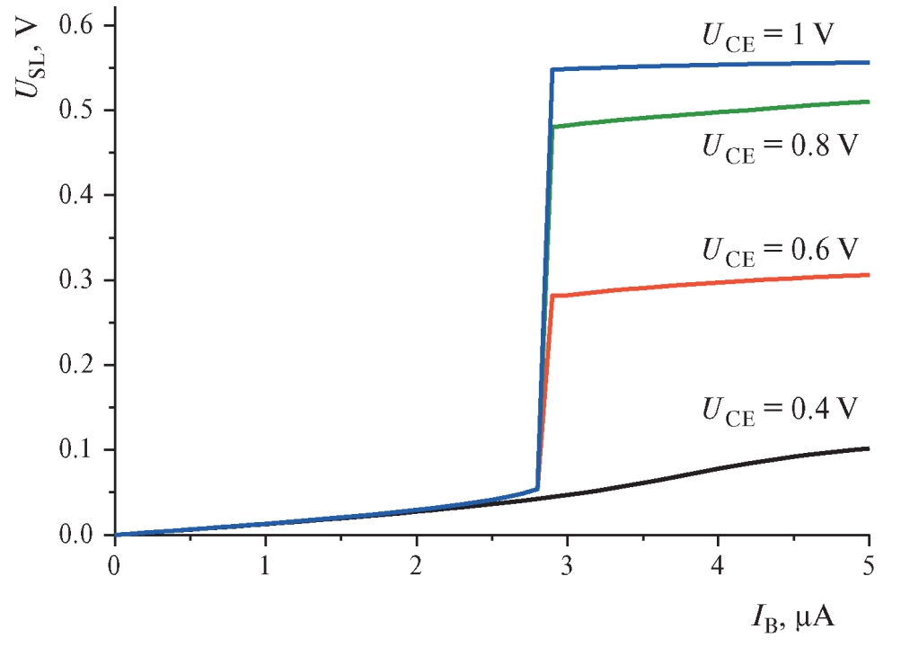 Особенности вольтамперных характеристик исследуемой структуры обусловлены наличием сверхрешетки в эмиттерной цепи транзистора. В результате N-образная вольтамперная характеристика сверхрешетки проявляется на передаточных и на выходных характеристиках транзистора. Если ток базы составляет менее 2.8 мкА, ток насыщения коллектора не превышает 1.9 мА. Следовательно, ток эмиттера также менее 1.9 мА, сверхрешетка представляет собой сопротивление с характерным значением 36.4 Ом, а транзистор работает в обычном режиме. При токе базы свыше 2.8 мкА и напряжении коллектор–эмиттер свыше 0.38 В сверхрешетка переходит в область с отрицательной дифференциальной проводимостью, что приводит к снижению эмиттерного и коллекторного токов транзистора при росте тока базы. Дальнейший рост напряжения коллектор–база свыше 1.0 В переводит сверхрешетку в низкоимпедансное состояние с последующим тепловым пробоем.