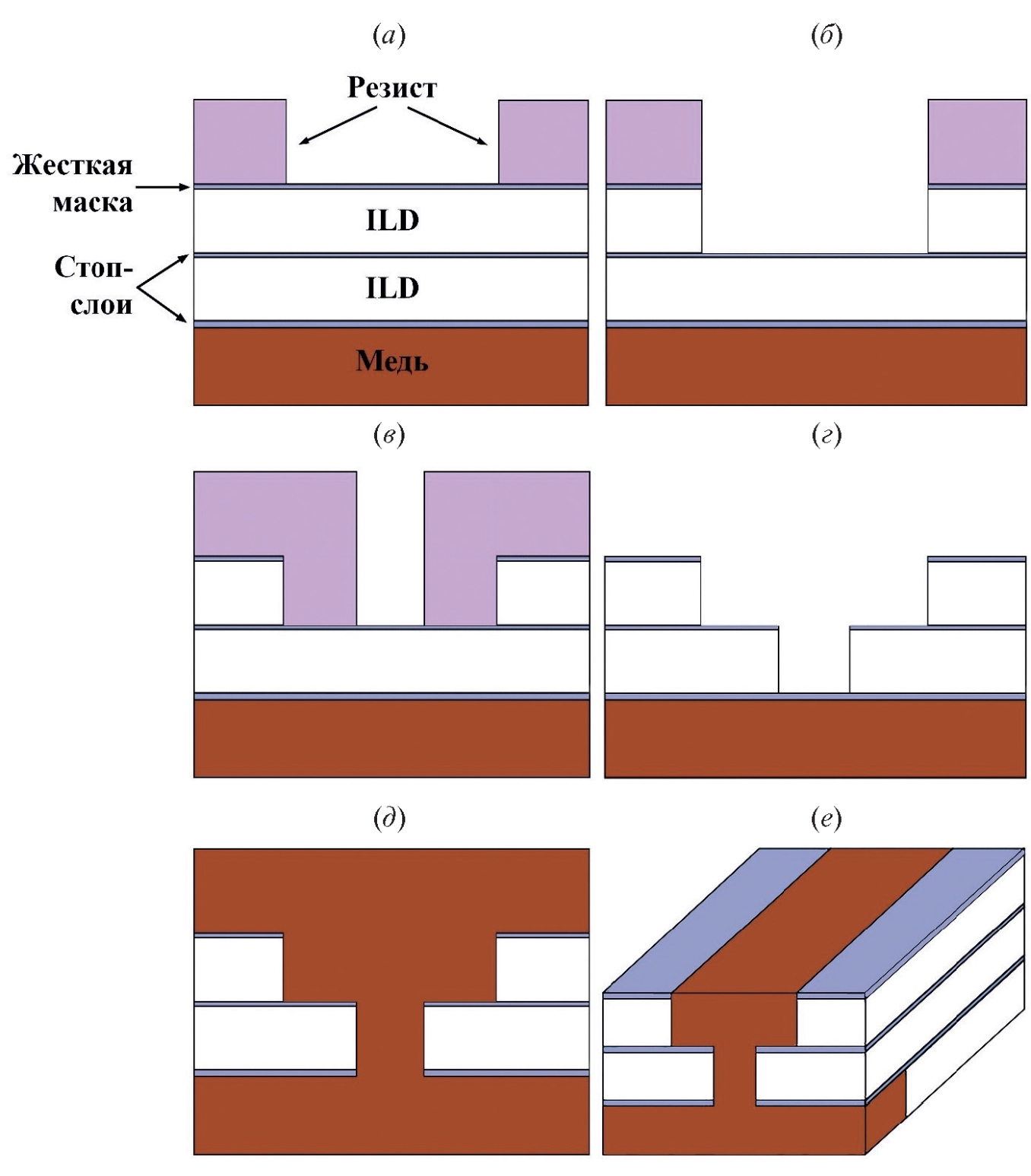 - с помощью литографии формируется маска, и далее производится анизотропное травление ILD до тех пор, пока не будет достигнут нижний стоп-слой. Стоп-слой при этом не вскрывается (рис. 2, а). После этого резист удаляется;