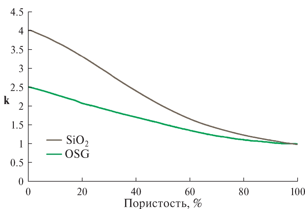 Поляризуемость может быть уменьшена с помощью использования материалов с меньшим количеством полярных групп. Это фторированные (FSG, k = 3.6) или органические (OSG) оксиды кремния (табл. 1) [17, 18]. Однако для более мелких структур этого подхода недостаточно, поэтому используются пористые структуры. Поры могут быть созданы путем добавления полимеров, которые затем удаляются в процессе термического отжига. В случае SiO2 необходима пористость (доля объема пор в общем объеме пористого тела) около 50% для достижения диэлектрической проницаемости 2. Если используется диэлектрик с диэлектрической проницаемостью 2.5, необходимо создать пористость 22% для достижения диэлектрической проницаемости 2 (рис. 4).