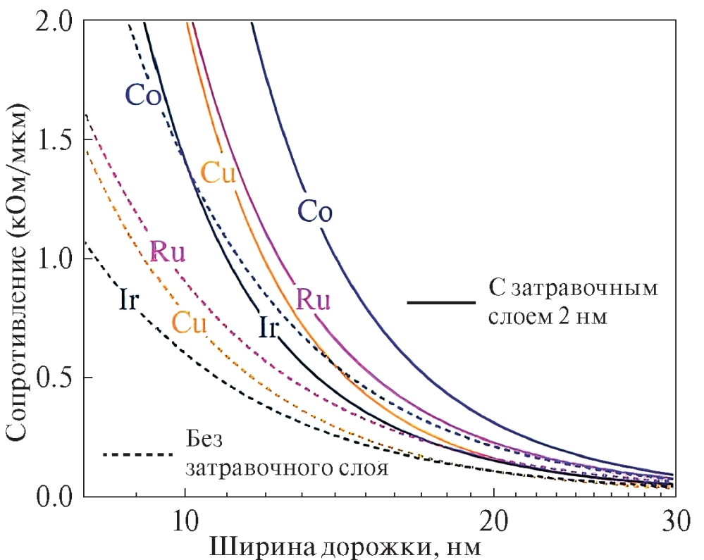 По мере масштабирования ИС на нижних уровнях системы металлизации возникает необходимость формирования линий с шириной менее 10 нм. Сопротивление медных дорожек быстро растет с уменьшением размеров. Это связано с увеличением вклада рассеяния электронов на поверхности и на границах зерен [4, 5]. Кроме того, для медных линий требуются барьерные слои фиксированной толщины, необходимые для предотвращения диффузии меди в low-k диэлектрик. Поэтому, когда сечение дорожек уменьшается, вклад барьерных слоев в сопротивление дорожки может оказаться слишком высоким. К тому же устойчивость меди к электромиграции при ширине дорожки менее 10 нм оказывается недостаточна.